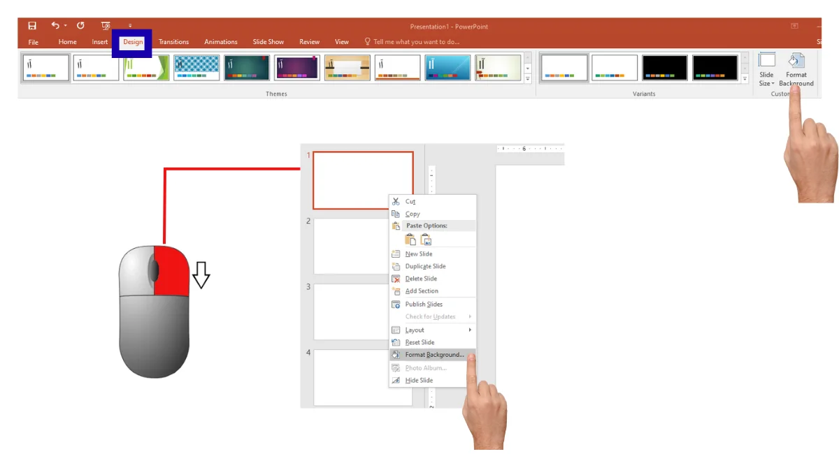 • برای انجام تغییر در پس زمینه اسلاید های پاورپوینت نیاز است تا طبق مراحل زیر پیش بروید: