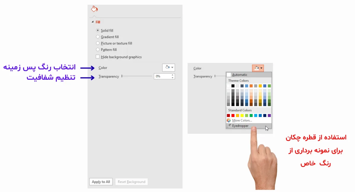 • Color : رنگ اسلاید مورد نظر را از این قسمت انتخاب کنید. علاوه بر رنگ های پیش فرض می توانید با انتخاب قطره چکان می توانید از سایر رنگ های موجود در اسلاید نمونه برداری کنید.