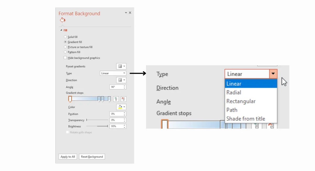• Type: نوع گرادیان را مشخص می کنیم. Linear خطی، Radial شعاعی، Rectangular  مستطیلی،  Path مسیر منحنی