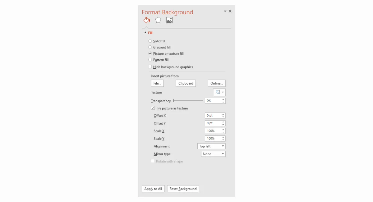 اگر گزینه  Picture or Texture Fill را انتخاب کنید می توانید تصویر دلخواه را از حافظه کامپیوتر خود انتخاب کنید.