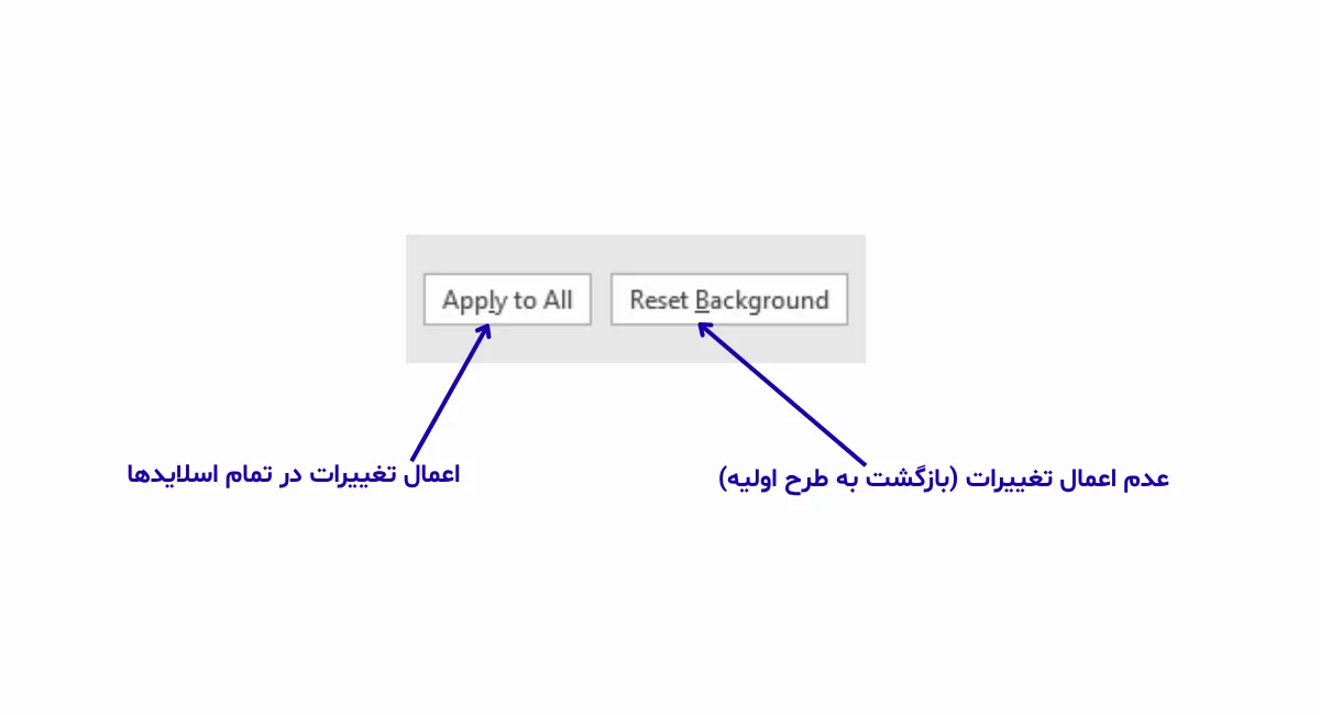 برای اینکه تغییرات را در تمام اسلاید ها اعمال کنید کافی است تا گزینه Apply to all را انتخاب کنید. در نظر داشته باشید اگر این گزینه را انتخاب نکنید تغییرات فقط در اسلاید جاری انجام می گیرد.