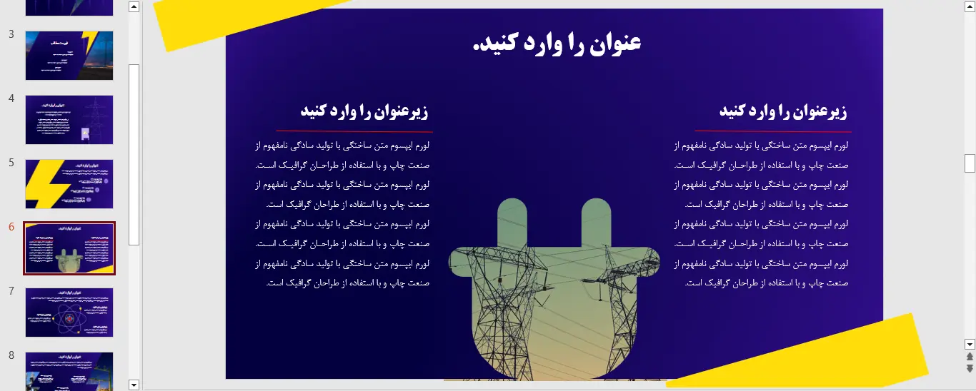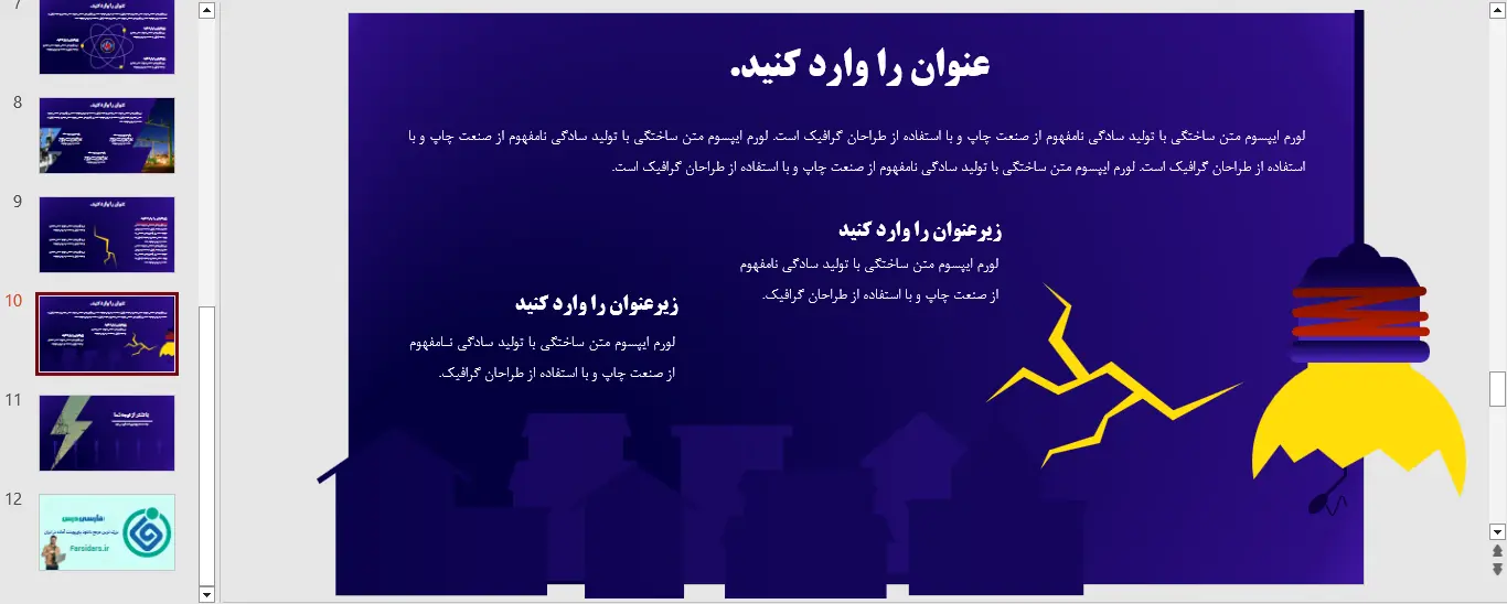 در نظر داشته باشید اگر تم پاورپوینت برق رایگان را دانلود کنید، می توانید با کمی خلاقیت طراحی آن را زیباتر کنید و برای سایر ارائه های خود از آن ایده بگیرید.
