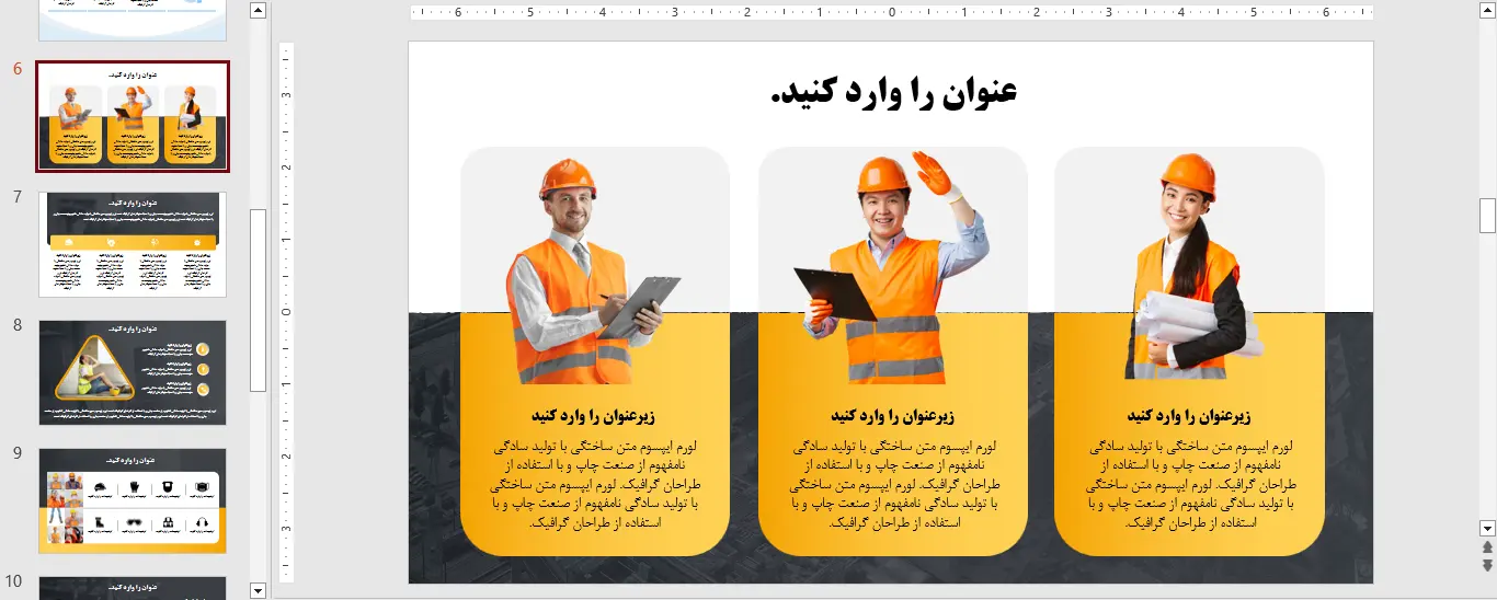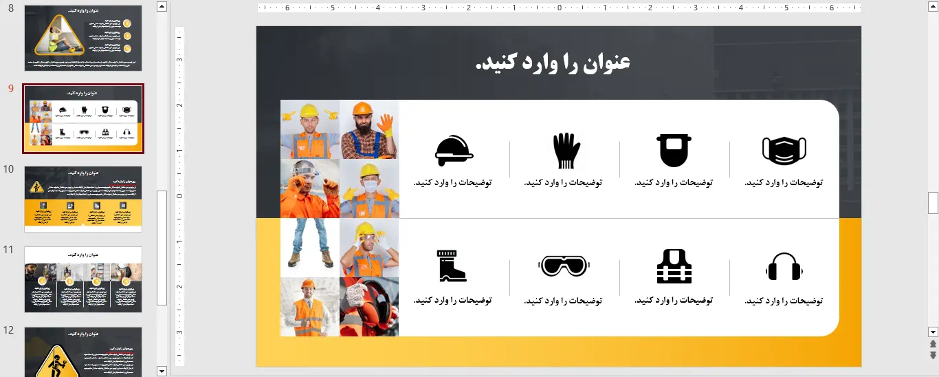 با استفاده از یک قالب پاورپوینت رایگان ایمنی ساختمان مناسب، می توانید بدون صرف زمان زیاد برای طراحی اسلایدها، روی انتقال مفاهیم کلیدی مانند مسیرهای خروج اضطراری، اصول کار با تجهیزات آتش نشانی و نکات ایمنی در محیط کار تمرکز کنید.