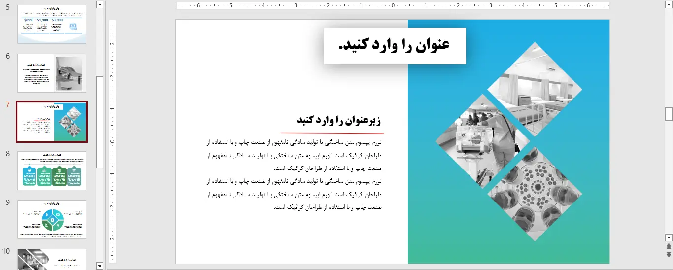 در پایان باید گفت انتخاب یک قالب پاورپوینت رایگان بیمارستان نه تنها باعث بهبود ظاهر ارائه شما می شود بلکه نظم و حرفه ای بودن کارتان را نشان می دهد. چه در زمینه آموزش، چه در جلسات مدیریتی یا حتی برای معرفی خدمات بیمارستانی، استفاده از قالب های آماده می تواند تاثیر بسزایی در موفقیت ارائه داشته باشد.