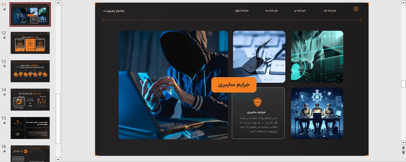 در نهایت باید گفت که آگاهی درباره جرایم سایبری به اندازه استفاده از فناوری اهمیت دارد. اگر قصد دارید ارائه ای آموزشی یا تحلیلی درباره این موضوع داشته باشید، پیشنهاد می شود از قالب پاورپوینت رایگان جرایم سایبری استفاده کنید تا بتوانید مفاهیم را با ظاهری حرفه ای و قابل درک برای مخاطب خود نمایش دهید.
