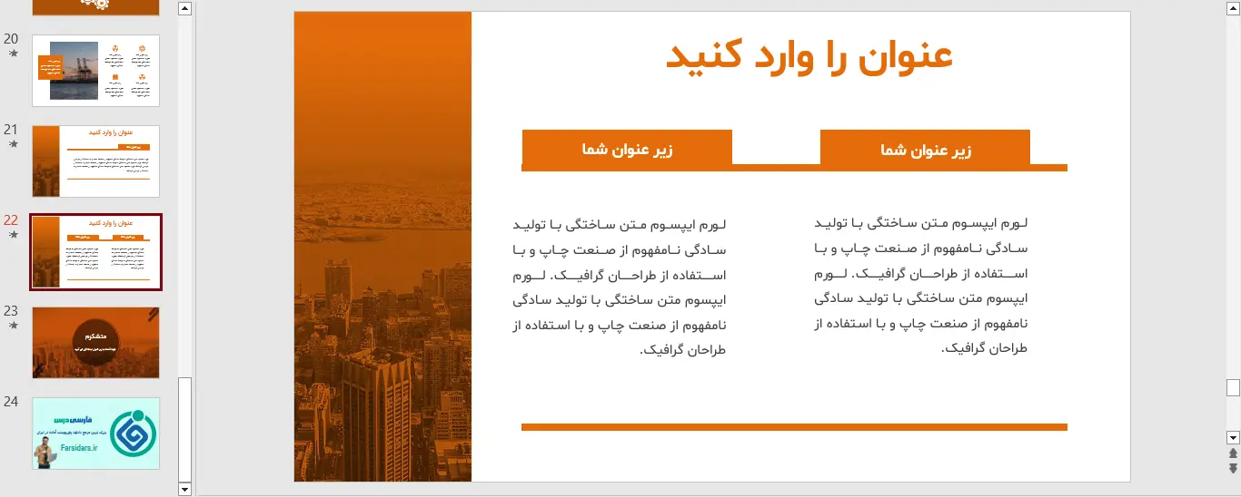 این پاورپوینت در قالب pptx. یا همان ppt. قابل دانلود می‌باشد. قالب پاورپوینت رایگان شهر کسب و کار در محیط Microsoft Powerpoint طراحی شده و در 22 اسلاید در اختیار شما قرار داده شده است. کیفیت و صحت اطلاعات مربوط به این پاورپوینت توسط تیم نشریه فارسی درس تایید شده است و شما با چند کلیک می‌توانید به راحتی این پاورپوینت را دریافت کنید. درصورت بروز هرگونه اشکال می‌توانید با ما در تماس باشید.