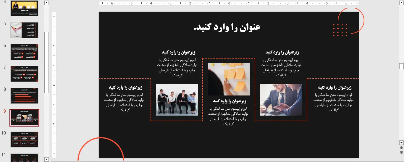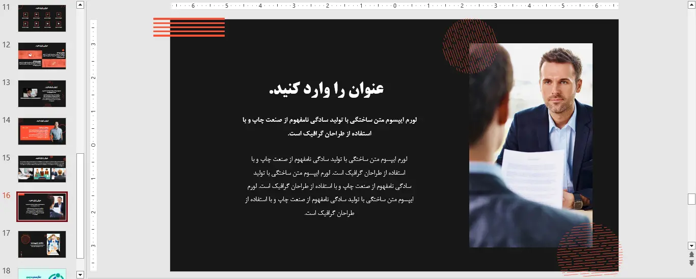 این پاورپوینت آماده درباره کسب و کار در قالب pptx. یا همان ppt. قابل دانلود می‌باشد. قالب پاورپوینت رایگان مصاحبه شغلی در محیط Microsoft Powerpoint طراحی شده و در 18 اسلاید در اختیار شما قرار داده شده است. کیفیت و صحت اطلاعات مربوط به این پاورپوینت توسط تیم نشریه فارسی درس تایید شده است و شما با چند کلیک می‌توانید به راحتی این پاورپوینت را دریافت کنید. درصورت بروز هرگونه اشکال می‌توانید با ما در تماس باشید.