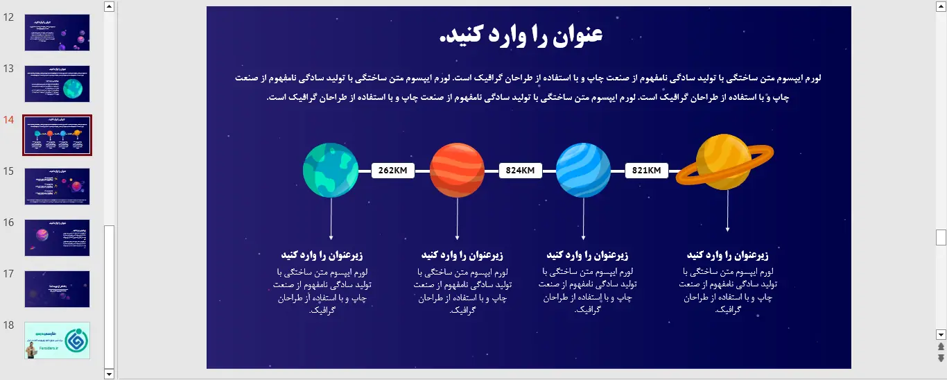 این پاورپوینت در قالب pptx. یا همان ppt. قابل دانلود میباشد. قالب پاورپوینت رایگان نجوم در محیط Microsoft Powerpoint طراحی شده و در 18 اسلاید در اختیار شما قرار داده شده است. کیفیت و صحت اطلاعات مربوط به این پاورپوینت توسط تیم نشریه فارسی درس تایید شده است و شما با چند کلیک میتوانید به راحتی این پاورپوینت را دریافت کنید. درصورت بروز هرگونه اشکال میتوانید با ما در تماس باشید.