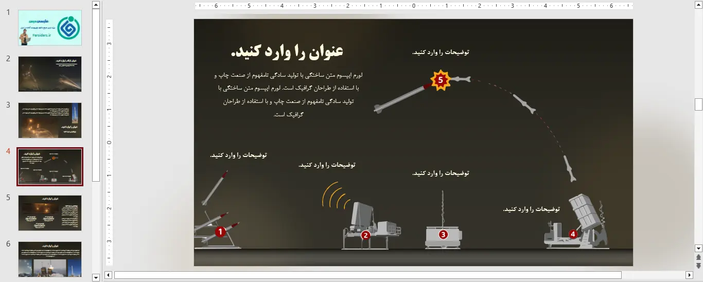 قالب پاورپوینت رایگان گنبد آهنین به شما امکان می دهد مطالب تخصصی درباره فناوری، عملکرد و اهمیت این سامانه را به صورت ساختارمند و زیبا ارائه دهید. این قالب شامل اسلایدهای متنوع با طراحی مدرن، نمودارها و تصویرهای مرتبط است که به فهم بهتر موضوع کمک می کند. استفاده از قالب پاورپوینت رایگان گنبد آهنین برای دانشجویان، پژوهشگران و فعالان حوزه نظامی بسیار مناسب است و باعث می شود ارائه شما حرفه ای تر و تاثیرگذارتر باشد.