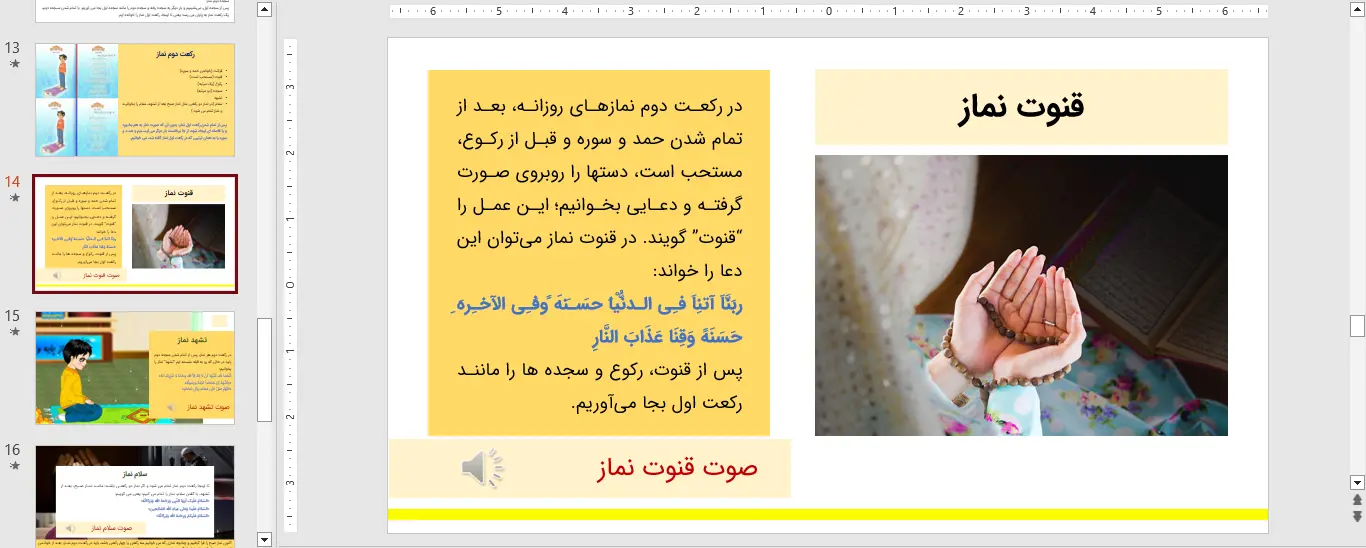 • در یک پاورپوینت آموزش نماز، مراحل وضو و نماز به صورت اسلاید به اسلاید و مصور نمایش داده می شوند. این روش به خصوص برای افرادی که از طریق دیدن بهتر یاد می گیرند، بسیار مفید است.