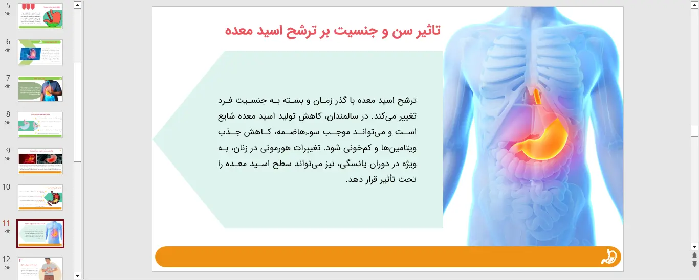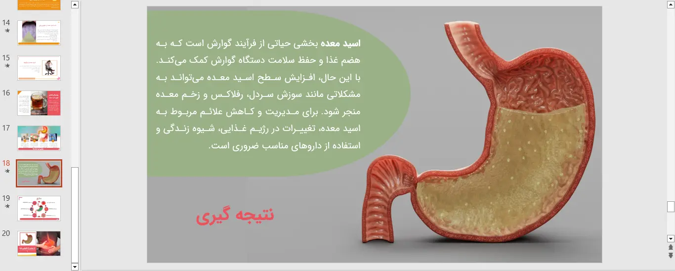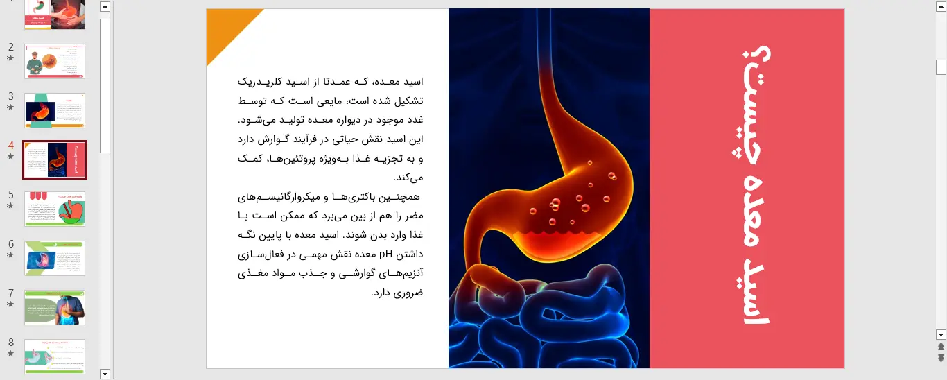 اسید معده ماده ای حیاتی برای هضم غذا و حفظ سلامت دستگاه گوارش است. شناخت عملکرد، خطرات و راه های کنترل این اسید از طریق آموزش علمی و استفاده از پاورپوینت اسید معده می تواند درک و یادگیری را چندین برابر آسان تر کند. اگر به دنبال یک منبع آموزشی شفاف و جذاب هستید، این نوع ارائه بهترین انتخاب برای شما خواهد بود.