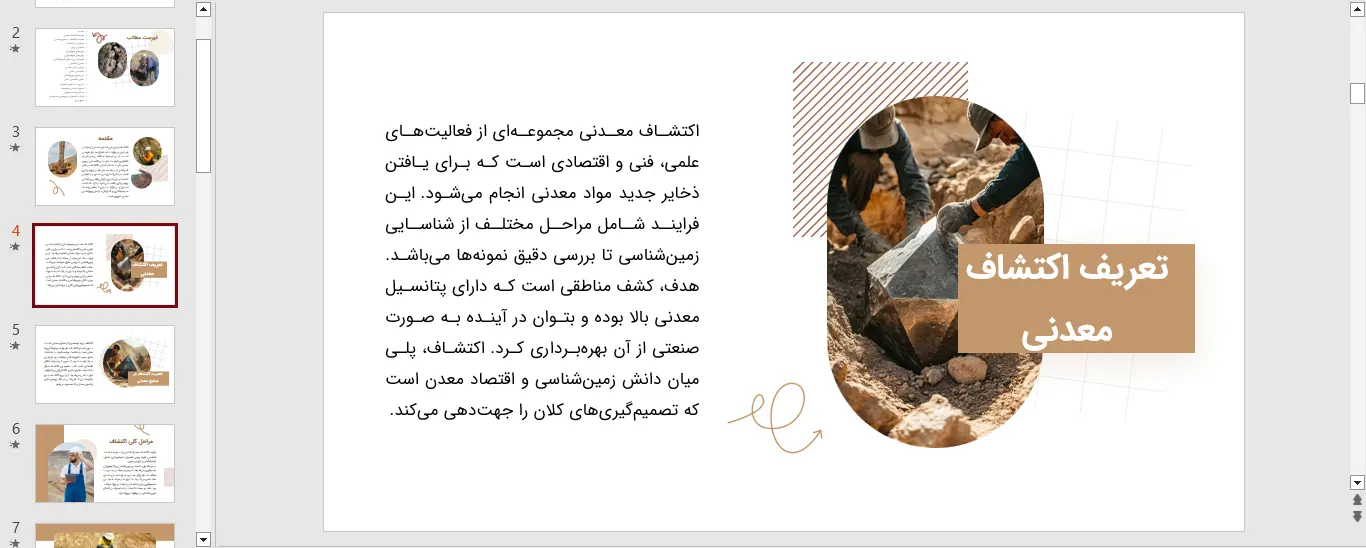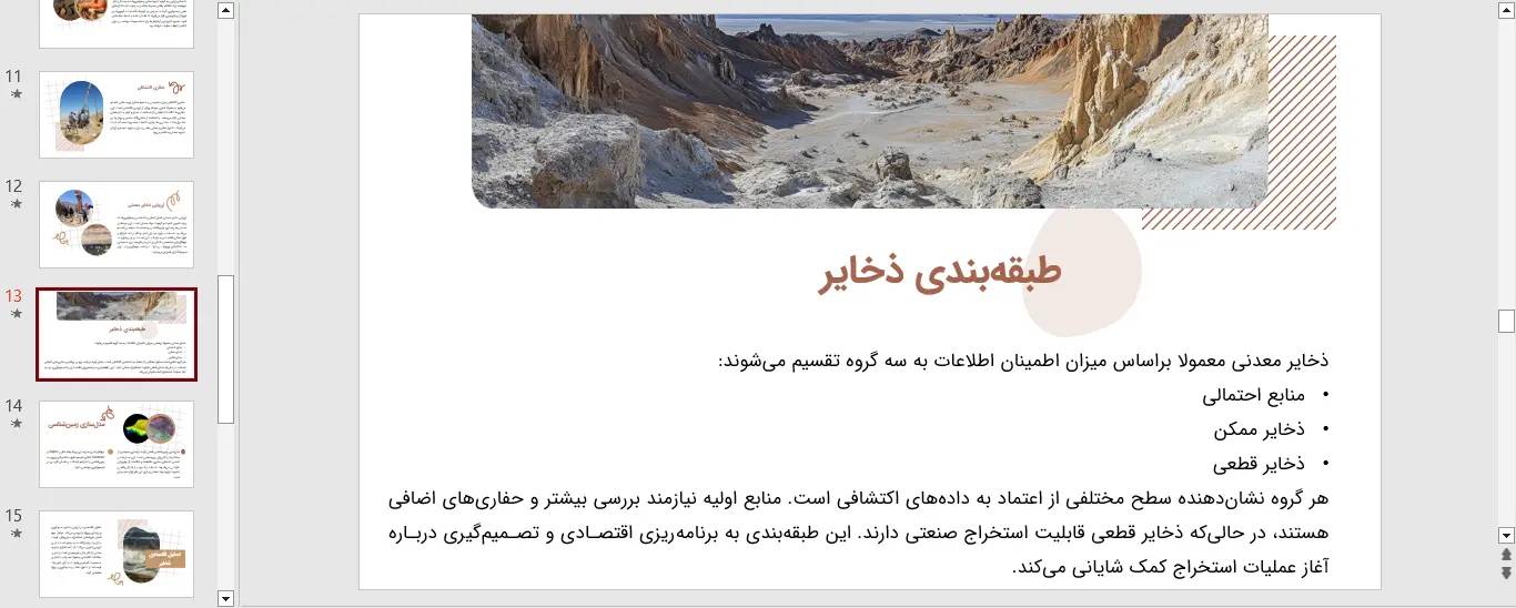 یک پاورپوینت اصول اکتشاف و ارزیابی ذخایر معدنی به طور مؤثر می تواند مراحل مختلف را از مرحله اکتشاف مقدماتی تا مرحله امکان سنجی اقتصادی تشریح کند. این ارائه باید شامل تفاوت روش های اکتشاف سطحی و زیرسطحی، اهمیت عیار بحرانی و روش های مختلف تخمین ذخیره (مانند روش های زمین آماری) باشد.