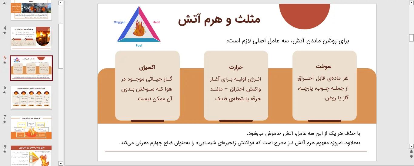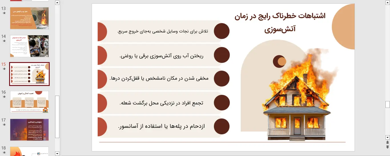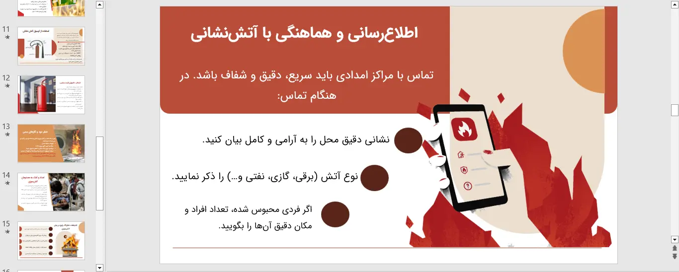 آتش سوزی یکی از حوادث غیر مترقبهای است که در صورت عدم رعایت نکات ایمنی و عدم آمادگی، میتواند خسارات جانی و مالی جبران ناپذیری به بار آورد. آموزش سریع و مؤثر به عموم مردم و کارکنان سازمانها امری حیاتی است و بهترین راه برای انتقال این اطلاعات حیاتی، استفاده از ابزارهای بصری آموزشی مانند پاورپوینت اقدامات فوری در برخورد با آتش سوزی است.