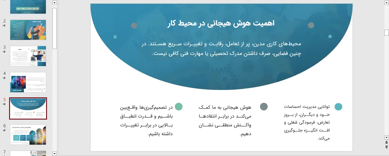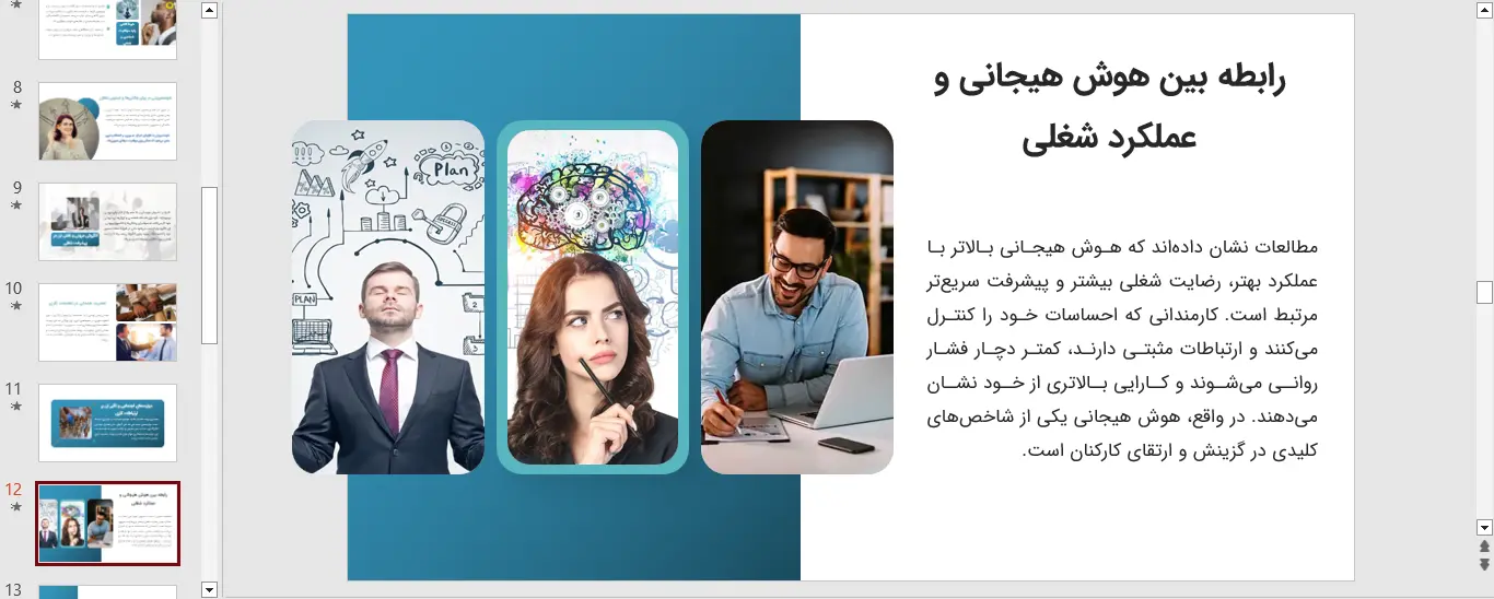 در نتیجه، آموزش مؤثر مفهوم هوش هیجانی از طریق پاورپوینت تأثیر هوش هیجانی بر موفقیت شغلی می تواند به افراد کمک کند تا نقاط قوت و ضعف خود را شناسایی کرده و مسیر شغلی خود را با آگاهی بیشتری توسعه دهند. استفاده از چنین منابع آموزشی باعث می شود کارکنان نه تنها در عملکرد کاری بلکه در روابط انسانی نیز موفق تر باشند.