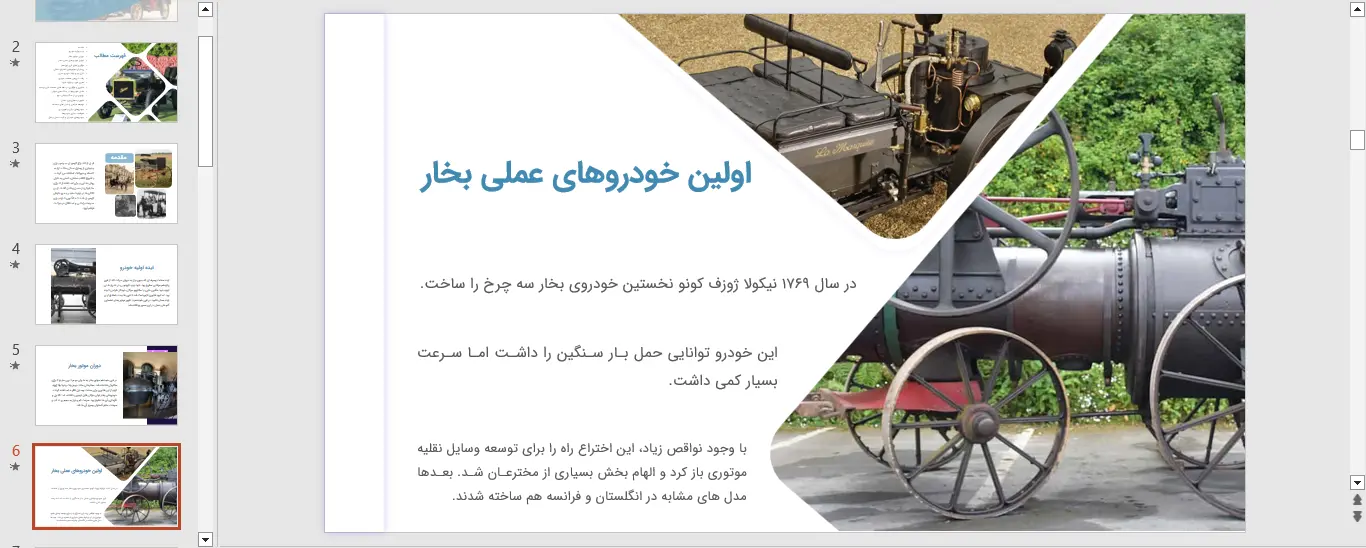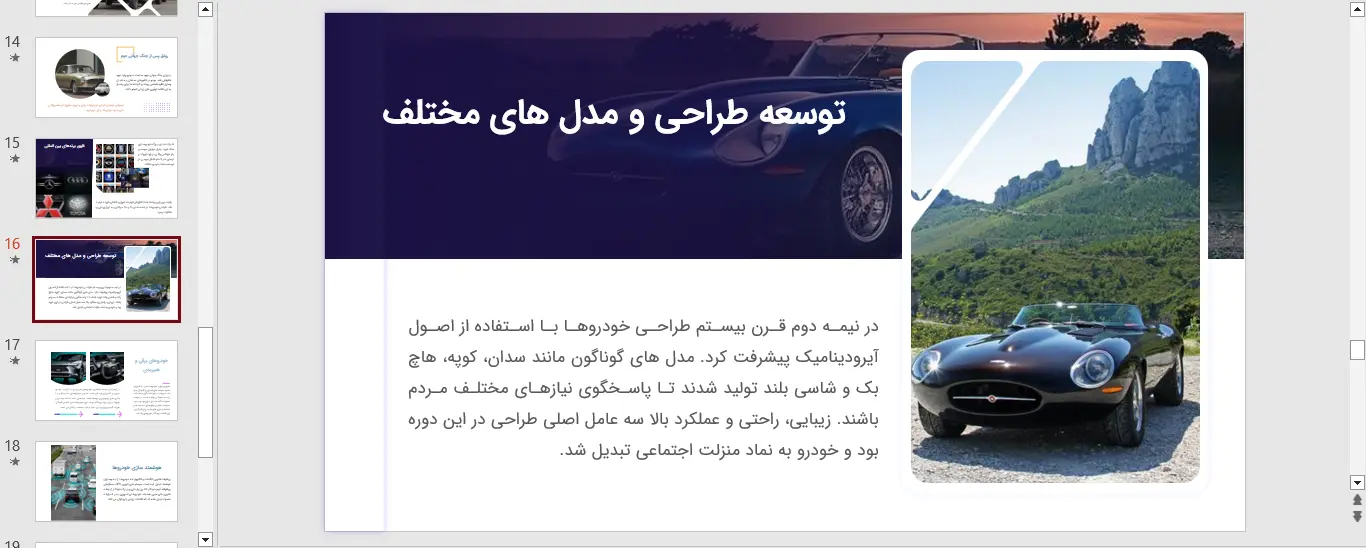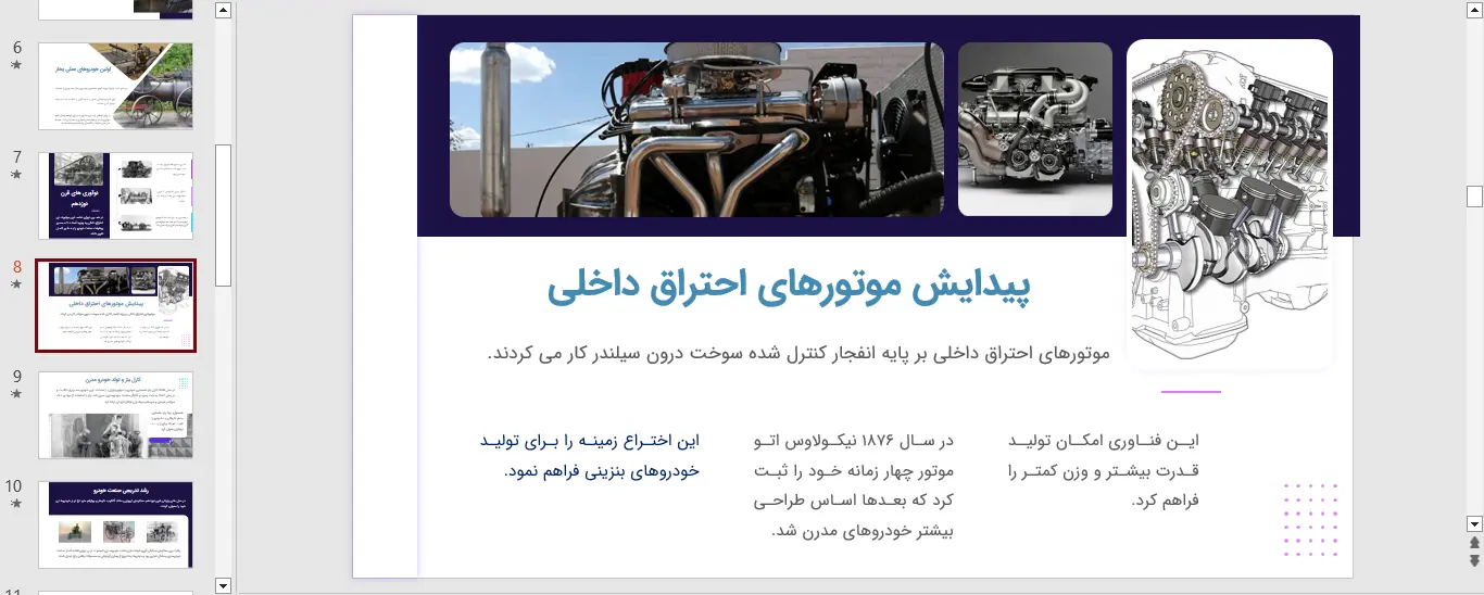 در یک پاورپوینت تاریخچه اتومبیل ها معمولا مطالبی درباره اختراع موتور درون سوز، گسترش تولید انبوه خودرو، پیدایش برندهای معروف و تغییرات طراحی خودرو در طول زمان وجود دارد. چنین قالب هایی به ارائه دهندگان کمک می کند تا روند پیشرفت صنعت خودرو را با تصاویر و توضیحات دقیق نمایش دهند و توجه مخاطبان را جلب کنند.