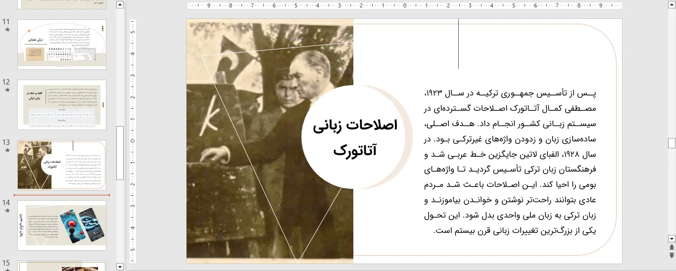 برای درک عمیق این تحولات، آماده‌سازی یک پاورپوینت تاریخچه زبان ترکی با جزئیات گرافیکی و تاریخی ضروری است. این ارائه می‌تواند سیر این زبان را از کتیبه‌های باستانی تا اصلاحات زبانی مدرن به خوبی نشان دهد.