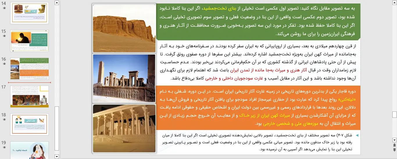پاورپوینت آماده ارائه شده در مورد خصایص فرهنگ ایرانی اسلامی پودمان 4 هنر دهم و یازدهم به شکل کامل و جامع تهیه و تدوین شده است. این ارائه با تصاویر گویا و جذابی که در خود دارد دانش آموزان را برای فراگیری و استفاده کامل از آن وا می دارد. یکی از بهترین پاورپوینت هایی که می توانید در بستر اینترنت در مورد موضوع ذکر شده پیدا کنید را در اختیار شما قرار داده ایم و امیدواریم از مطالب آن نهایت استفاده را ببرید. ارائه کامل و جذاب شما از اهداف مجموعه فارسی درس است و تلاش ما برداشتن قدم هایی هر چند کوچک در راستای اهداف شما است.