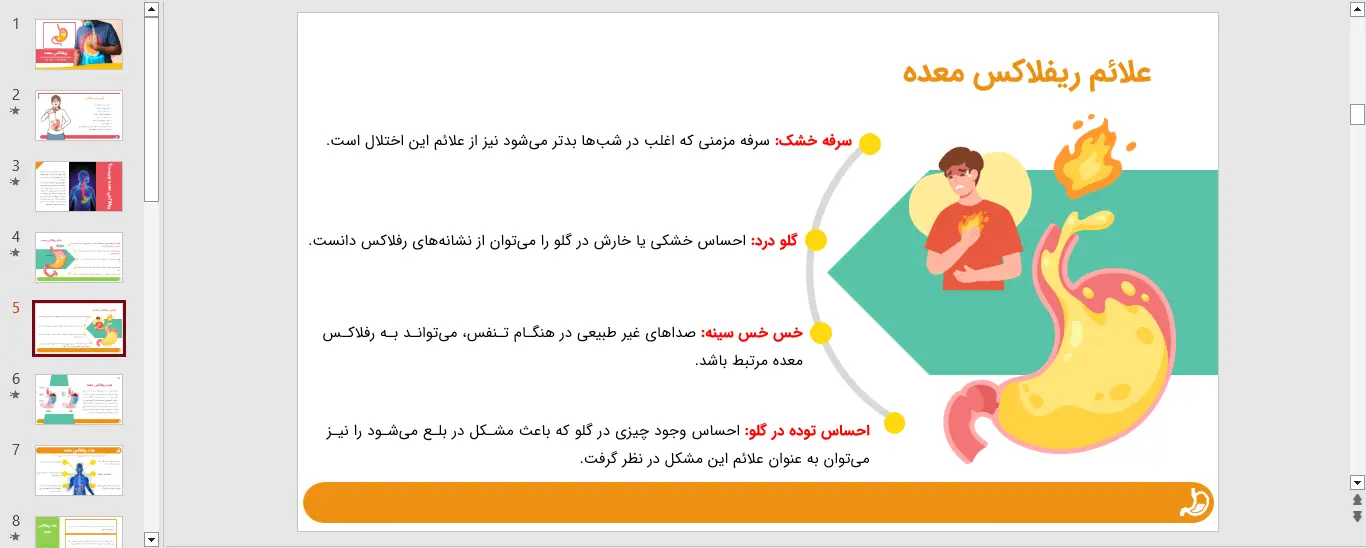 بیماری ریفلاکس معده که به آن بازگشت اسید به مری نیز گفته می شود، یک عارضه شایع گوارشی است که تاثیر قابل توجهی بر کیفیت زندگی افراد دارد. برای آگاهی رسانی دقیق و علمی در مورد علل، علائم، و روش های مدیریت این بیماری، استفاده از ابزارهای بصری مناسب ضروری است. در این راستا، تهیه یک پاورپوینت ریفلاکس معده ساختار یافته و جذاب می تواند نقش محوری ایفا کند.