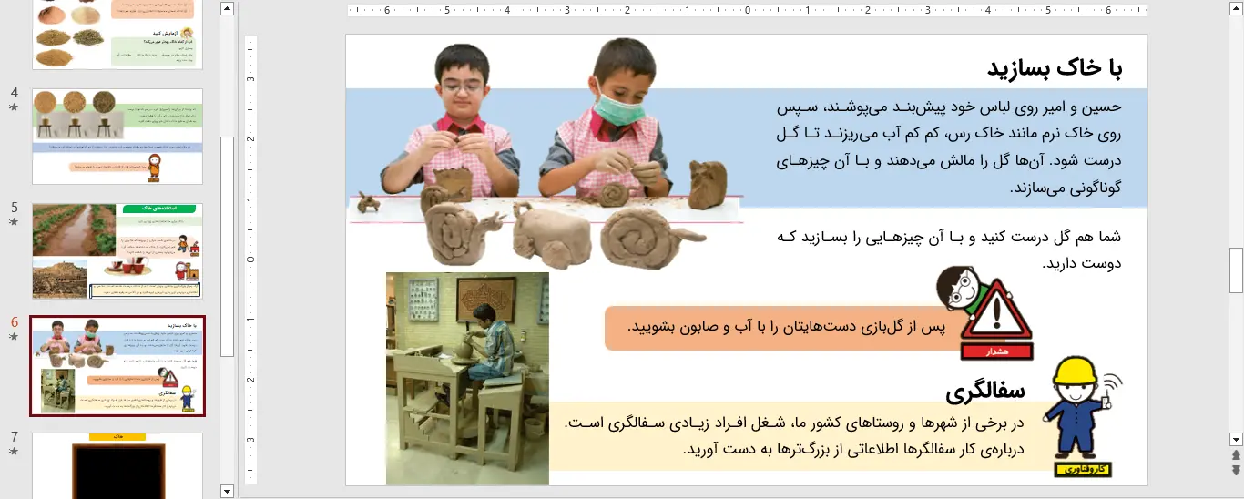 حسین و امیر روی لباس خود پیشبند میپوشند، سپس روی خاک نرم مانند خاک رس، کم کم آب میریزند تا گل درست شود. آنها گل را مالش میدهند و با آن چیزهای گوناگونی میسازند.