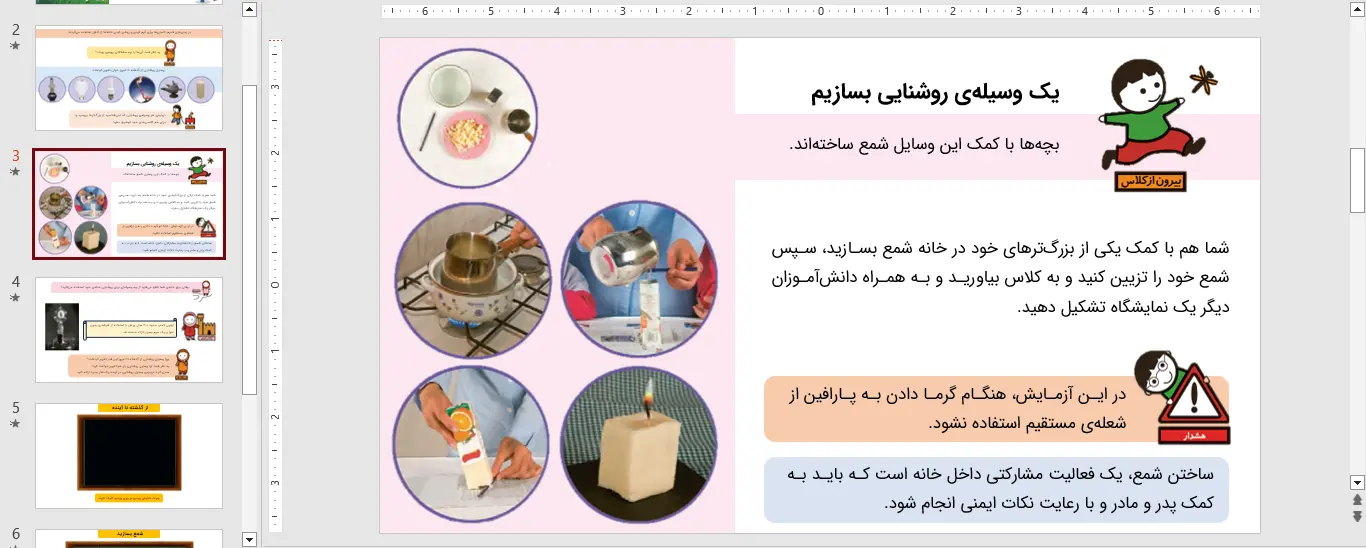 شما هم با کمک یکی از بزرگترهای خود در خانه شمع بسازید، سپس شمع خود را تزیین کنید و به کلاس بیاورید و به همراه دانشآموزان دیگر یک نمایشگاه تشکیل دهید.