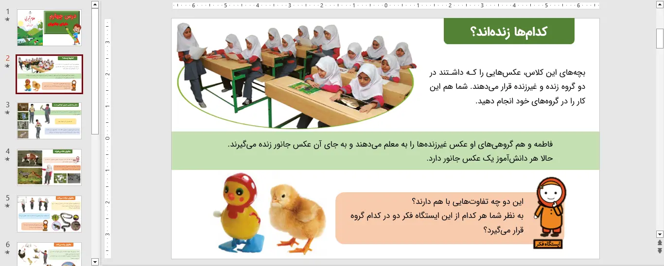 بچههای این کلاس، عکسهایی را که داشتند در دو گروه زنده و غیرزنده قرار میدهند. شما هم این کار را در گروههای خود انجام دهید.