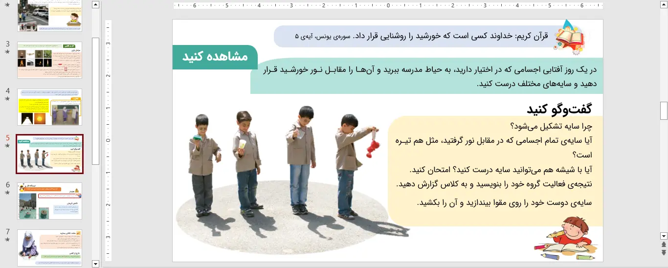 در یک روز آفتابی اجسامی که در اختیار دارید، به حیاط مدرسه ببرید و آن‌ها را مقابل نور خورشید قرار دهید و سایه‌های مختلف درست کنید.