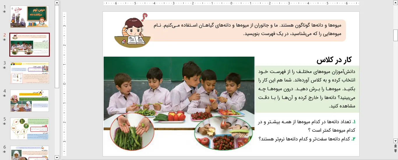 دانشآموزان ميوههای مختلف را از فهرست خود انتخاب كرده و به كلاس آوردهاند. شما هم اين كار را بكنيد. ميوهها را برش دهيد. درون ميوهها چه میبينید؟ دانهها را خارج كرده و آنها را با دقت مشاهده کنيد.