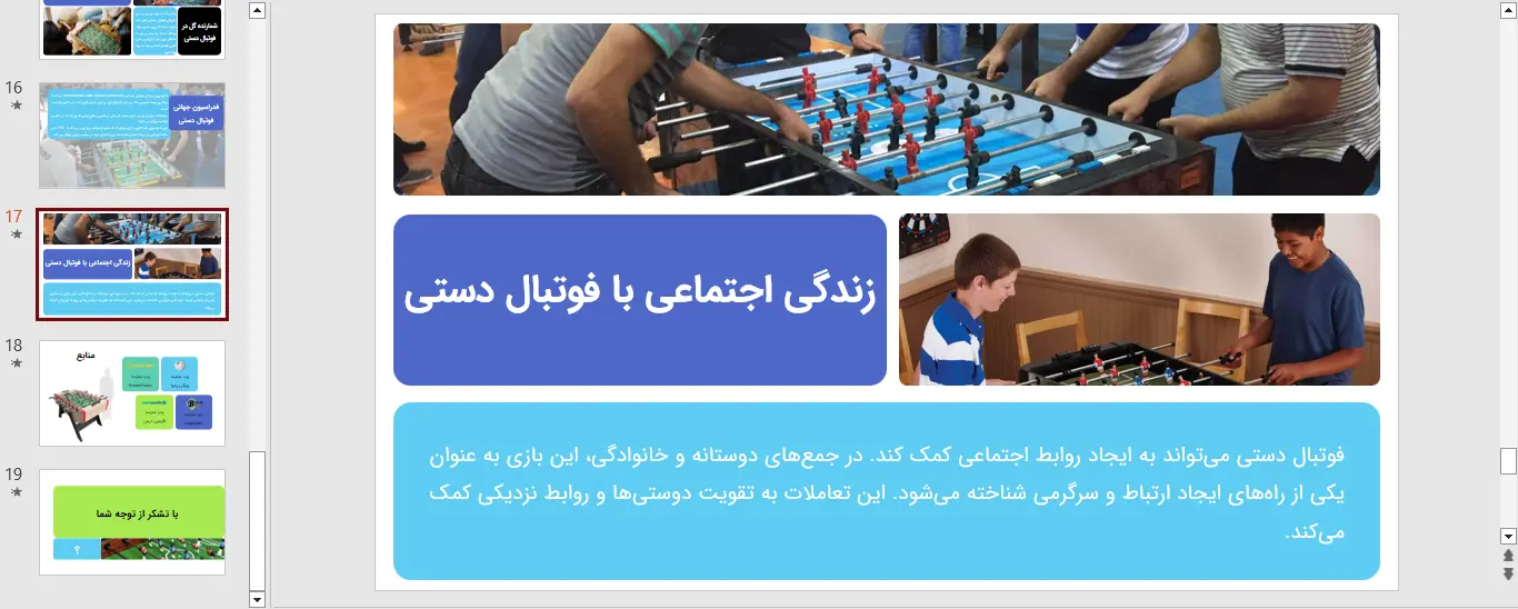 در این زمینه، استفاده از منابع آموزشی ساختاریافته اهمیت دو چندان پیدا می‌کند. اگر به دنبال یادگیری جامع و تصویری هستید، پاورپوینت فوتبال دستی می‌تواند بهترین ابزار شما باشد. این نوع محتوا معمولاً شامل دیاگرام‌های مختلفی از بهترین زاویه‌های شوت، نحوه دفاع مؤثر در برابر حریف، و چگونگی اجرای تکنیک‌های پیشرفته مانند “جارو کردن” یا “پاپ هوک” است.