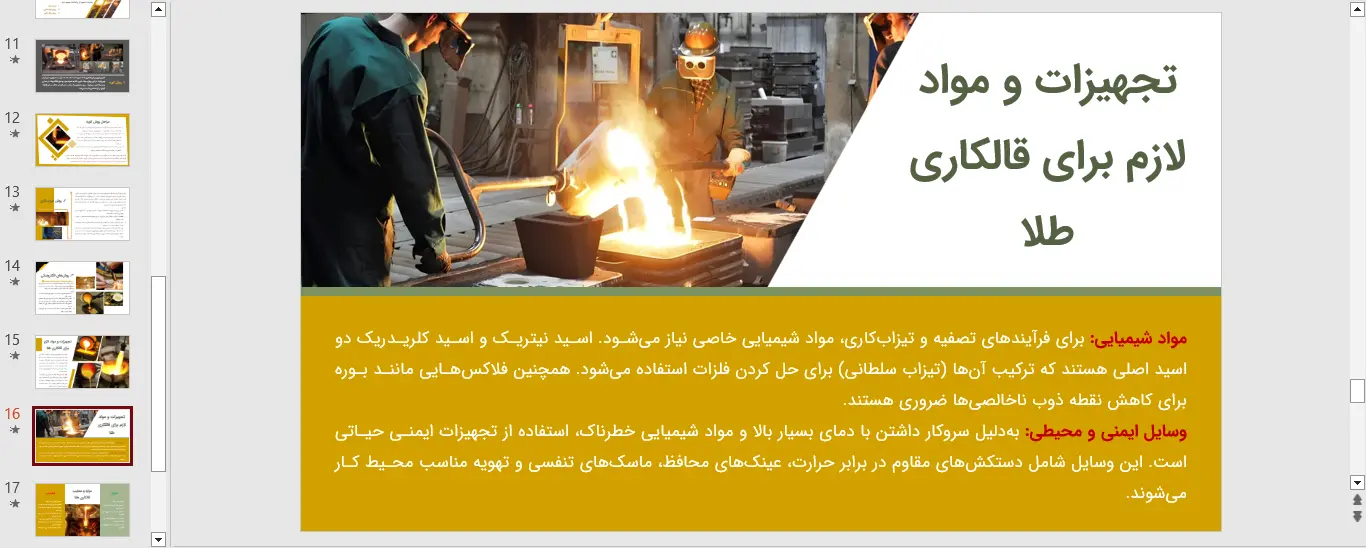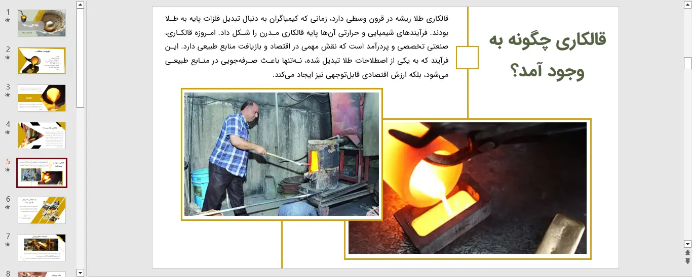 استفاده از یک پاورپوینت قالکاری طلا به شما این امکان را میدهد که مراحل پیچیده این فرایند را به صورت بصری و مرحله به مرحله دنبال کنید. یک ارائه حرفهای باید شامل موارد زیر باشد:
