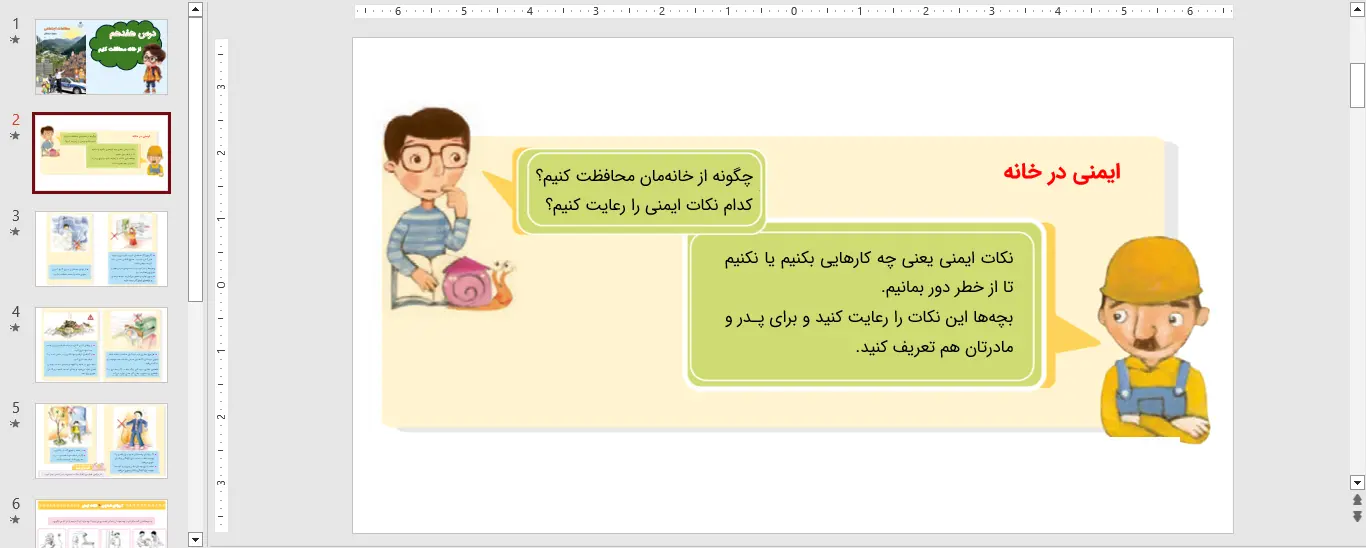این پاورپوینت مطالعات اجتماعی سوم در قالب pptx. یا همان ppt. قابل دانلود میباشد. پاورپوینت مطالعات اجتماعی سوم درس 17 هفدهم – از خانه محافظت کنیم در محیط Microsoft Powerpoint طراحی شده و در 10 اسلاید در اختیار شما قرار داده شده است. کیفیت و صحت اطلاعات مربوط به این پاورپوینت توسط تیم نشریه فارسی درس تایید شده است و شما با چند کلیک میتوانید به راحتی این پاورپوینت را دریافت کنید. درصورت بروز هرگونه اشکال میتوانید با ما در تماس باشید.