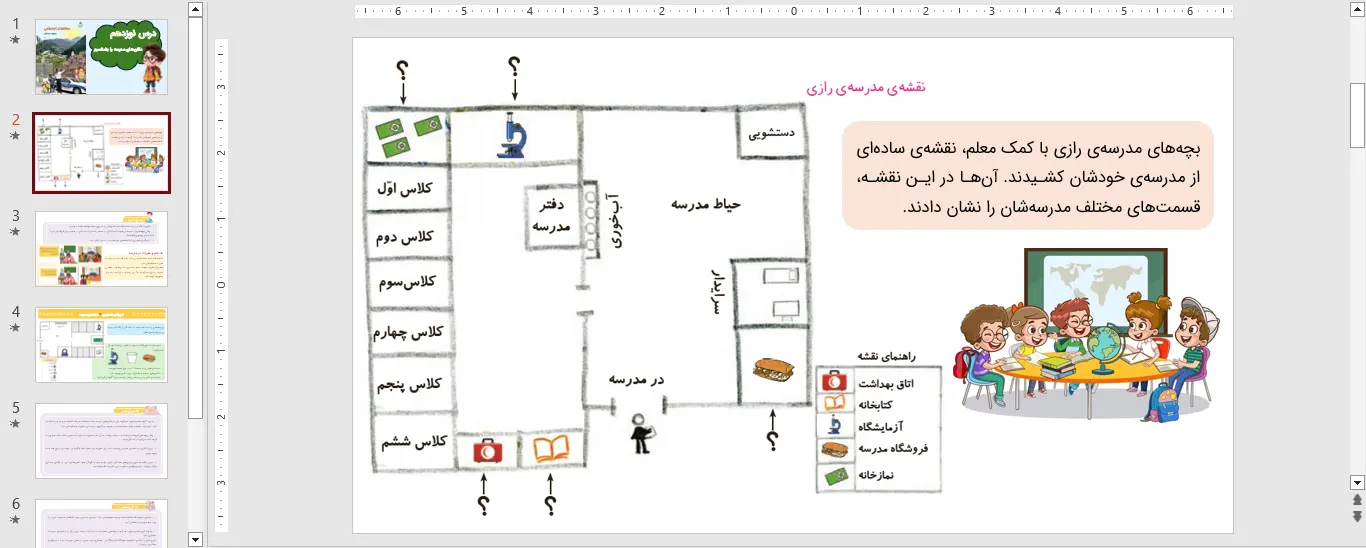 بچههای مدرسهی رازی با کمک معلم، نقشهی سادهای از مدرسهی خودشان کشیدند. آنها در این نقشه، قسمتهای مختلف مدرسهشان را نشان دادند.