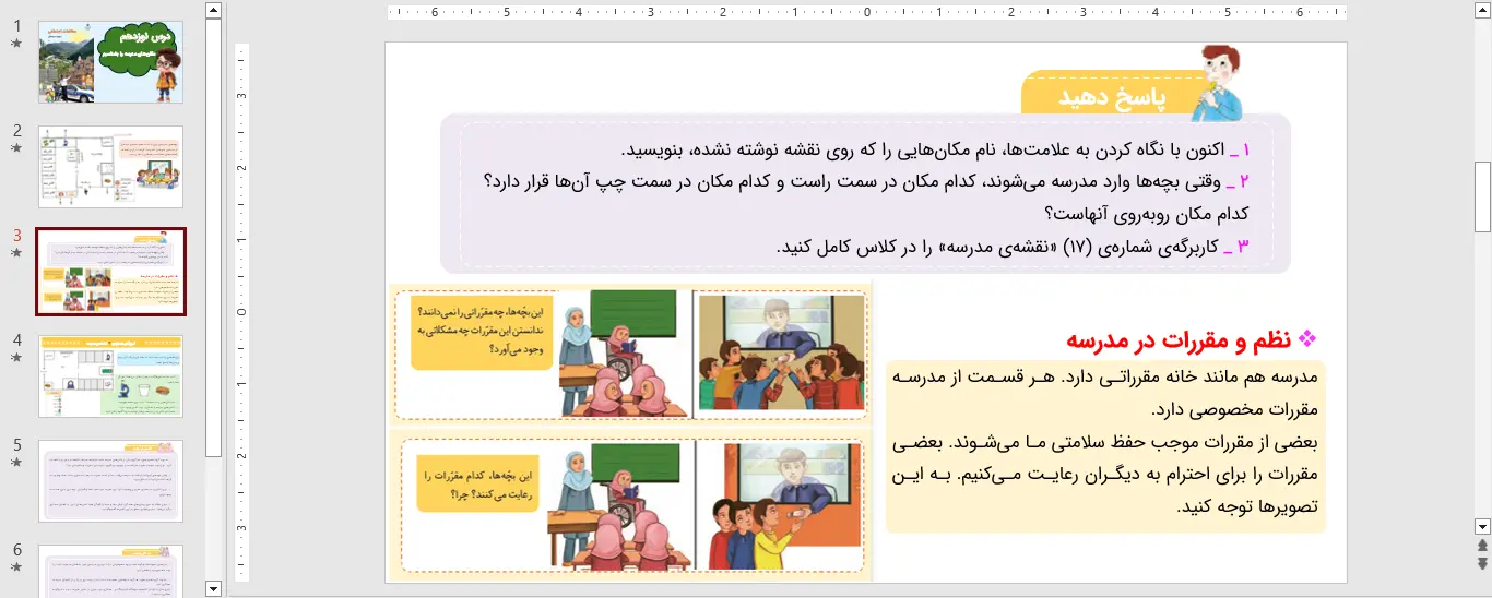 این پاورپوینت مطالعات اجتماعی سوم در قالب pptx. یا همان ppt. قابل دانلود میباشد. پاورپوینت مطالعات اجتماعی سوم درس 19 نوزدهم – مکانهای مدرسه را بشناسیم در محیط Microsoft Powerpoint طراحی شده و در 7 اسلاید در اختیار شما قرار داده شده است. کیفیت و صحت اطلاعات مربوط به این پاورپوینت توسط تیم نشریه فارسی درس تایید شده است و شما با چند کلیک میتوانید به راحتی این پاورپوینت را دریافت کنید. درصورت بروز هرگونه اشکال میتوانید با ما در تماس باشید.