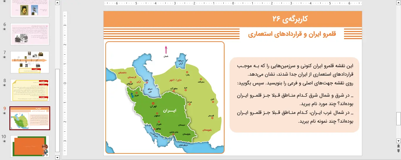 پاورپوینت مطالعات اجتماعی ششم درس بیست و یکم – مبارزه‌ی مردم ایران با استعمار در قالب ppt. یا pptx. می‌باشد و با اسلاید های گرافیکی و جذاب به شما کمک می‌کند یک تدریس و یا ارائه بی‌نظیر داشته باشید. با دانلود این پاورپوینت می‌توانید به راحتی آن را ویرایش و شخصی‌سازی کنید. این پاورپوینت مطابق با آخرین ویرایش کتب درسی (سال تحصیلی 1404-1405) می باشد.