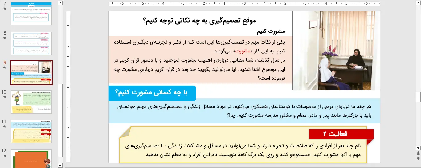 این پاورپوینت مطالعات اجتماعی ششم در قالب pptx. یا همان ppt. قابل دانلود میباشد. پاورپوینت مطالعات اجتماعی ششم درس چهارم – چگونه تصمیم بگیریم؟ در محیط Microsoft Powerpoint طراحی شده و در 12 اسلاید در اختیار شما قرار داده شده است. کیفیت و صحت اطلاعات مربوط به این پاورپوینت توسط تیم نشریه فارسی درس تایید شده است و شما با چند کلیک میتوانید به راحتی این پاورپوینت را دریافت کنید. درصورت بروز هرگونه اشکال میتوانید با ما در تماس باشید.