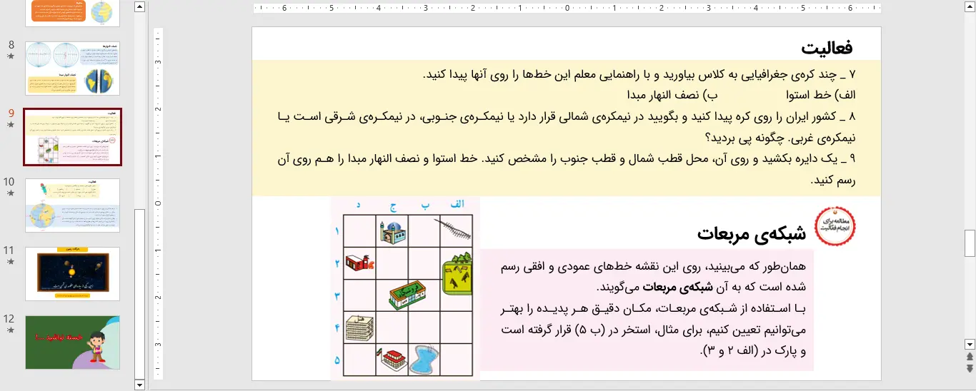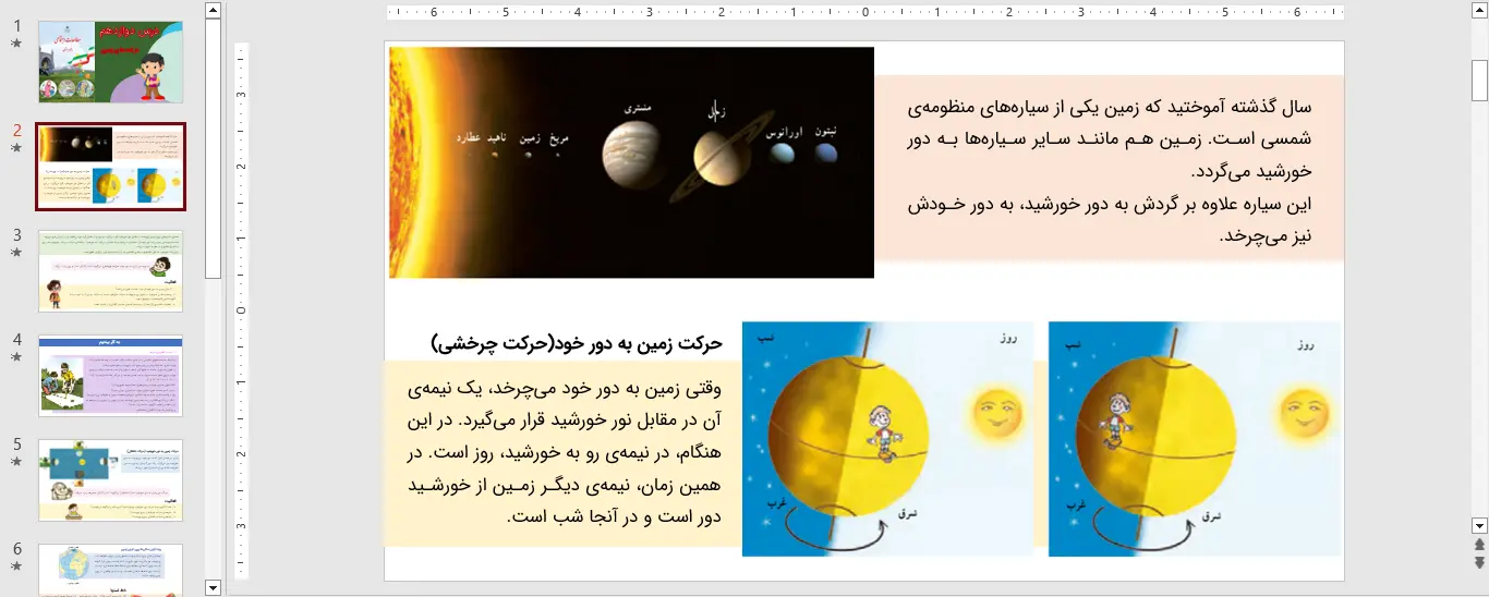 این پاورپوینت مطالعات اجتماعی پنجم در قالب pptx. یا همان ppt. قابل دانلود می‌باشد. پاورپوینت مطالعات اجتماعی پنجم درس دوازدهم – حرکت های زمین در محیط Microsoft Powerpoint طراحی شده و در 12 اسلاید در اختیار شما قرار داده شده است. کیفیت و صحت اطلاعات مربوط به این پاورپوینت توسط تیم نشریه فارسی درس تایید شده است و شما با چند کلیک می‌توانید به راحتی این پاورپوینت را دریافت کنید. درصورت بروز هرگونه اشکال می‌توانید با ما در تماس باشید.