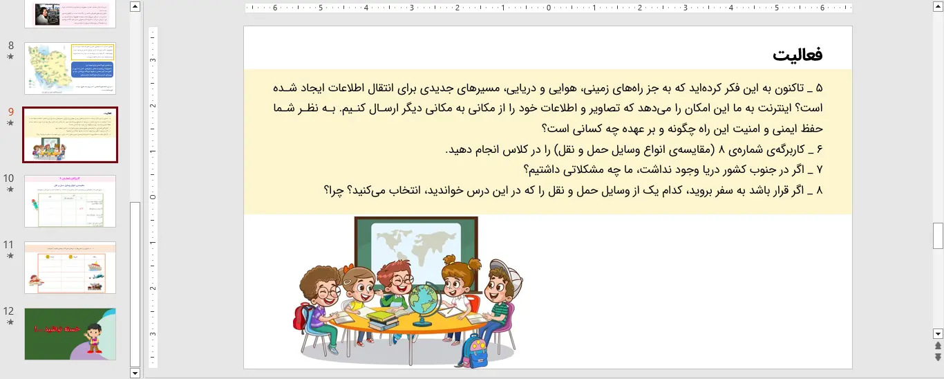 این پاورپوینت مطالعات اجتماعی پنجم در قالب pptx. یا همان ppt. قابل دانلود می‌باشد. پاورپوینت مطالعات اجتماعی پنجم درس نهم – راه ها و حمل و نقل (2) در محیط Microsoft Powerpoint طراحی شده و در 12 اسلاید در اختیار شما قرار داده شده است. کیفیت و صحت اطلاعات مربوط به این پاورپوینت توسط تیم نشریه فارسی درس تایید شده است و شما با چند کلیک می‌توانید به راحتی این پاورپوینت را دریافت کنید. درصورت بروز هرگونه اشکال می‌توانید با ما در تماس باشید.