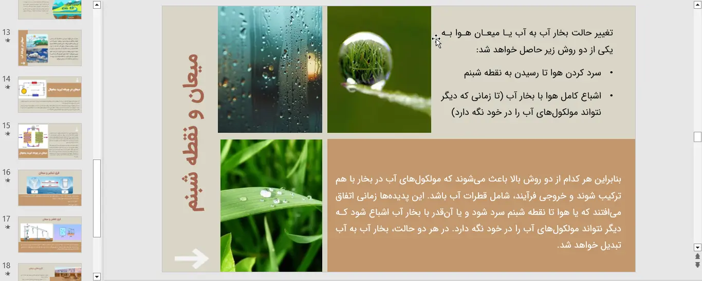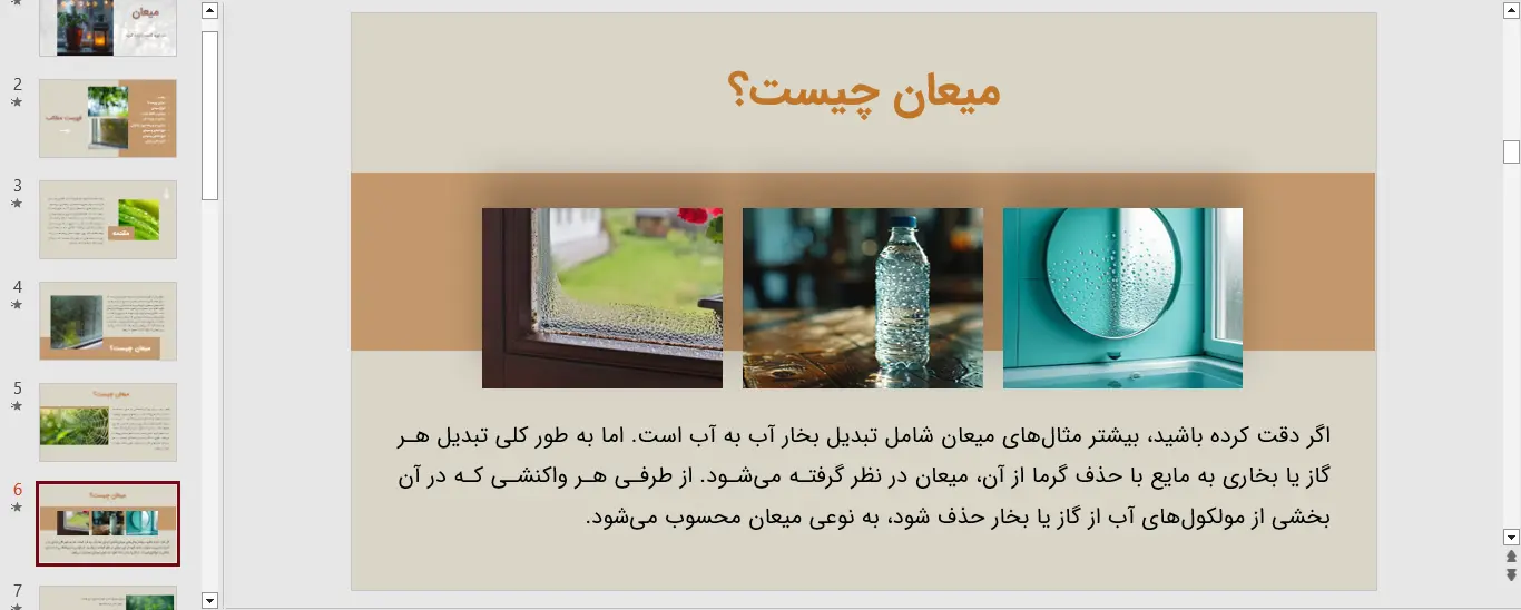 میعان زمانی اتفاق میافتد که بخار یا گاز با کاهش دما یا افزایش فشار، انرژی جنبشی مولکولهای خود را از دست میدهد و به حالت مایع درمیآید. این فرآیند دقیقاً عکس تبخیر است و در چرخههای طبیعی مانند چرخه آب در کره زمین مشاهده میشود. در یک پاورپوینت میعان میتوان نمودارهای دما و فشار و نحوه تغییر وضعیت ماده را نمایش داد.