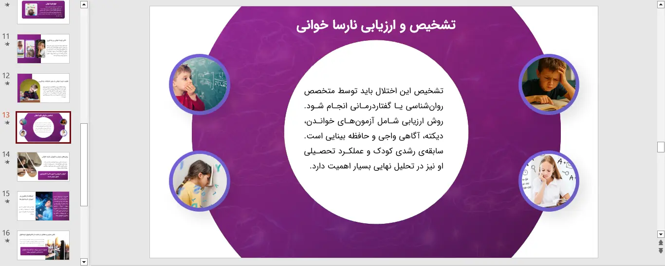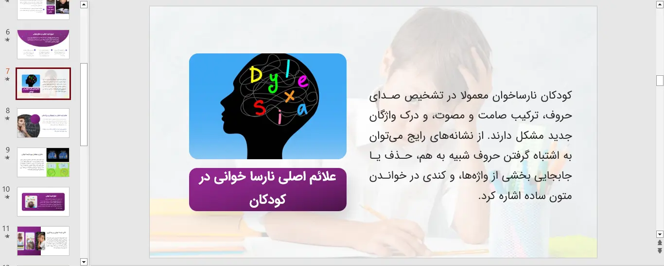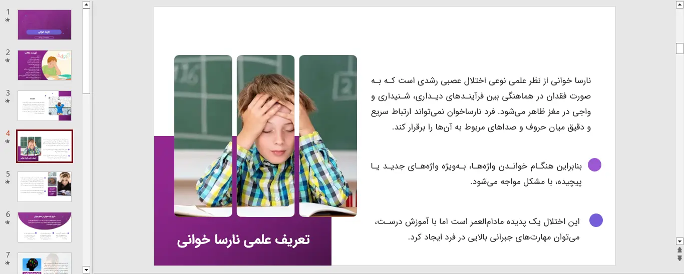 یکی از مؤثرترین ابزارهای کمک آموزشی که میتواند به معلمان و والدین یاری رساند، تهیه یک پاورپوینت نارسا خوانی هدفمند است. این ابزار دیجیتال امکان استفاده از فونتهای مخصوص، پسزمینههای با کنتراست بالا و تقسیم متن به بخشهای کوچکتر را فراهم میکند که همگی به کاهش بار شناختی کمک میکنند.