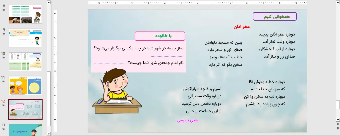 پاورپوینت ارائه شده در مورد هدیه های آسمان پنجم درس 7 هفتم – رنگین کمان جمعه به شکل کامل و جامع تهیه و تدوین شده است. این پاورپوینت آماده با تصاویر گویا و جذابی که در خود دارد دانش آموزان را برای فراگیری و استفاده کامل از آن وا می دارد. یکی از بهترین پاورپوینت هایی که می توانید در بستر اینترنت در مورد موضوع ذکر شده پیدا کنید را در اختیار شما قرار داده ایم و امیدواریم از مطالب آن نهایت استفاده را ببرید. ارائه کامل و جذاب شما از اهداف مجموعه فارسی درس است و تلاش ما برداشتن قدم هایی هر چند کوچک در راستای اهداف شما است.