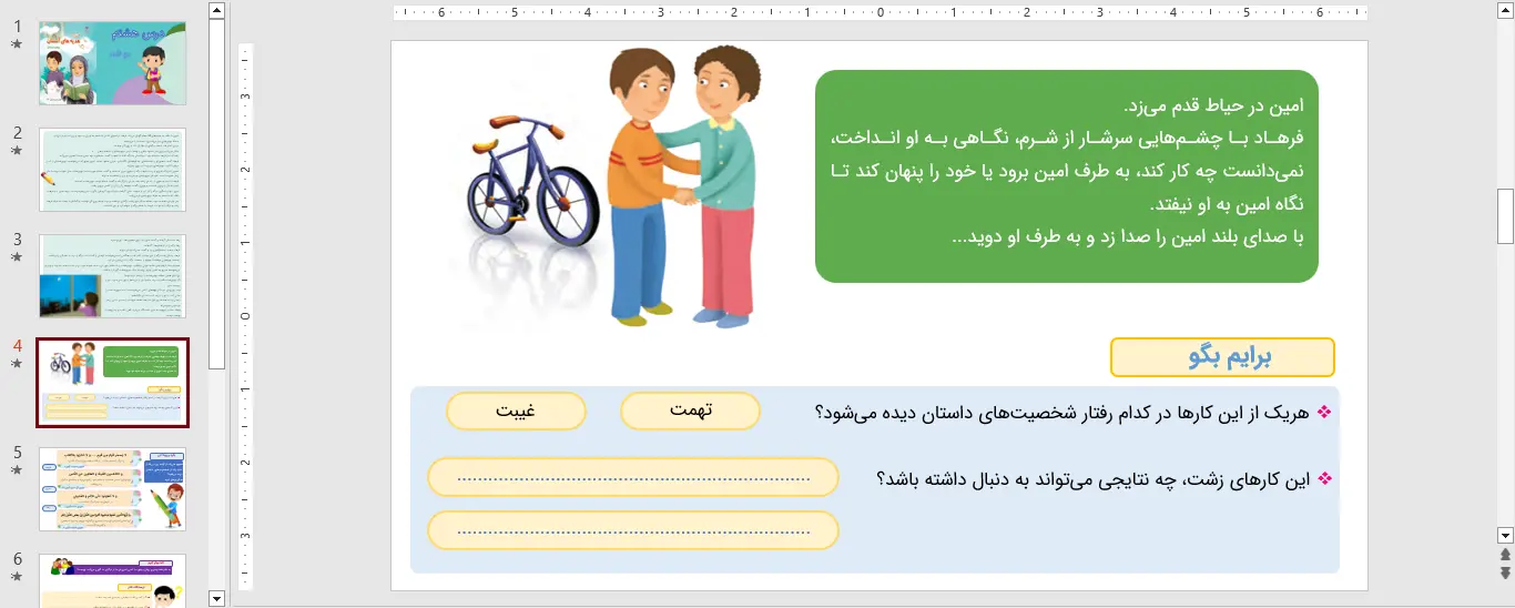 همین که زنگ تفریح را زدند، فرهاد برگه را جلوی امین انداخت و گفت: «حالا خوب است دوچرخهات مال خودت نیست! مال پسر عمویت است. خودش دوچرخهی نو خریده و این را بخشیده به تو!»
