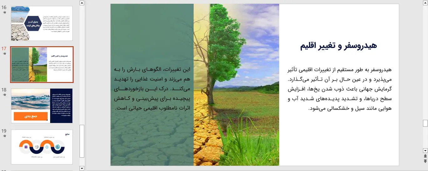 در نهایت، پاورپوینت هیدروسفر ابزاری قدرتمند برای نمایش اهمیت این منابع محدود و ارائه راهکارهای مهندسی برای حفظ تعادل آنها در برابر فشارهای محیطی و جمعیتی است.