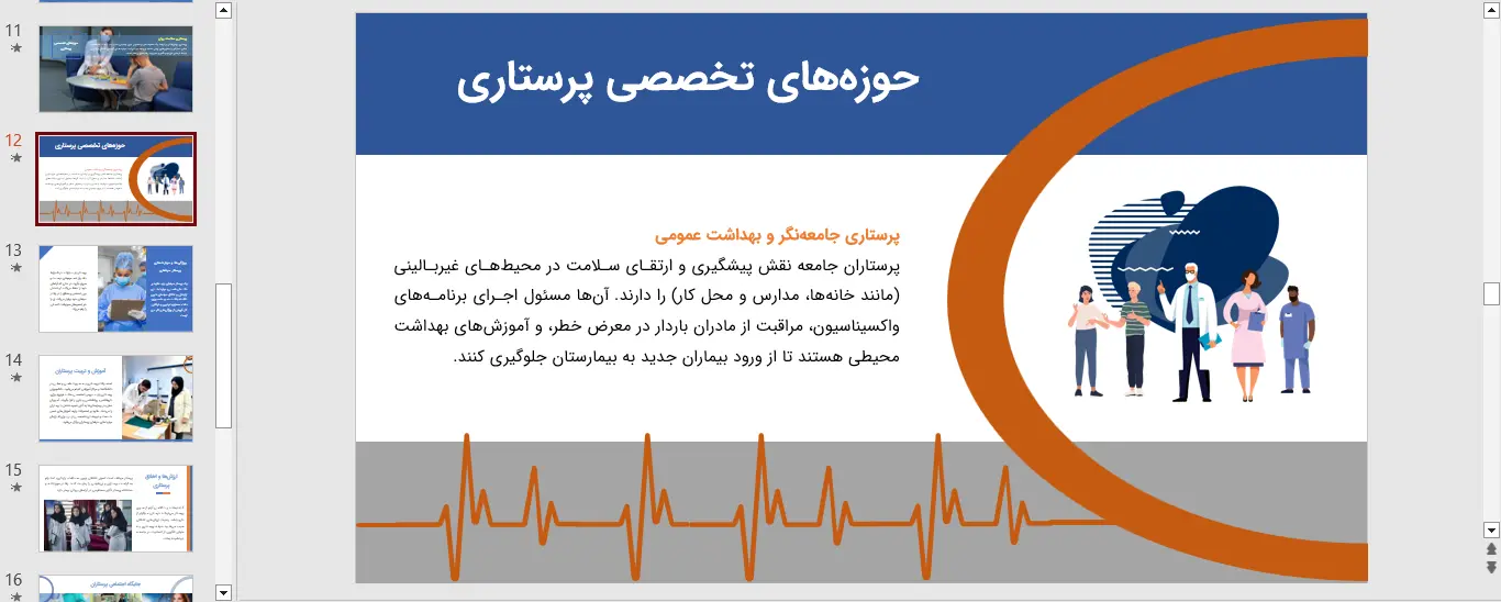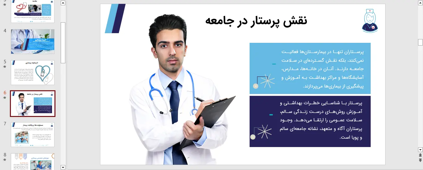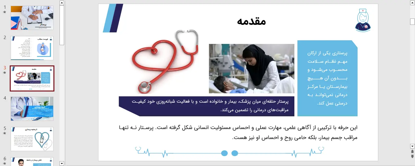 در مجموع، هر پاورپوینت پرستار که با دقت طراحی شود، نه تنها به ارتقاء سطح دانش در این حوزه کمک می کند، بلکه احترام به زحمات این قشر زحمتکش را نیز در پی دارد.