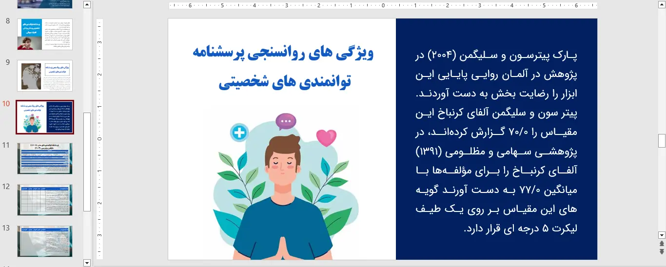 ما برای تسهیل کار شما، یک منبع آموزشی کامل و حرفه ای را تهیه کرده ایم. با استفاده از پاورپوینت پرسشنامه توانمندی های منش، می توانید یک ارائه علمی بی نقص داشته باشید. این پاورپوینت جامع شامل موارد زیر است: