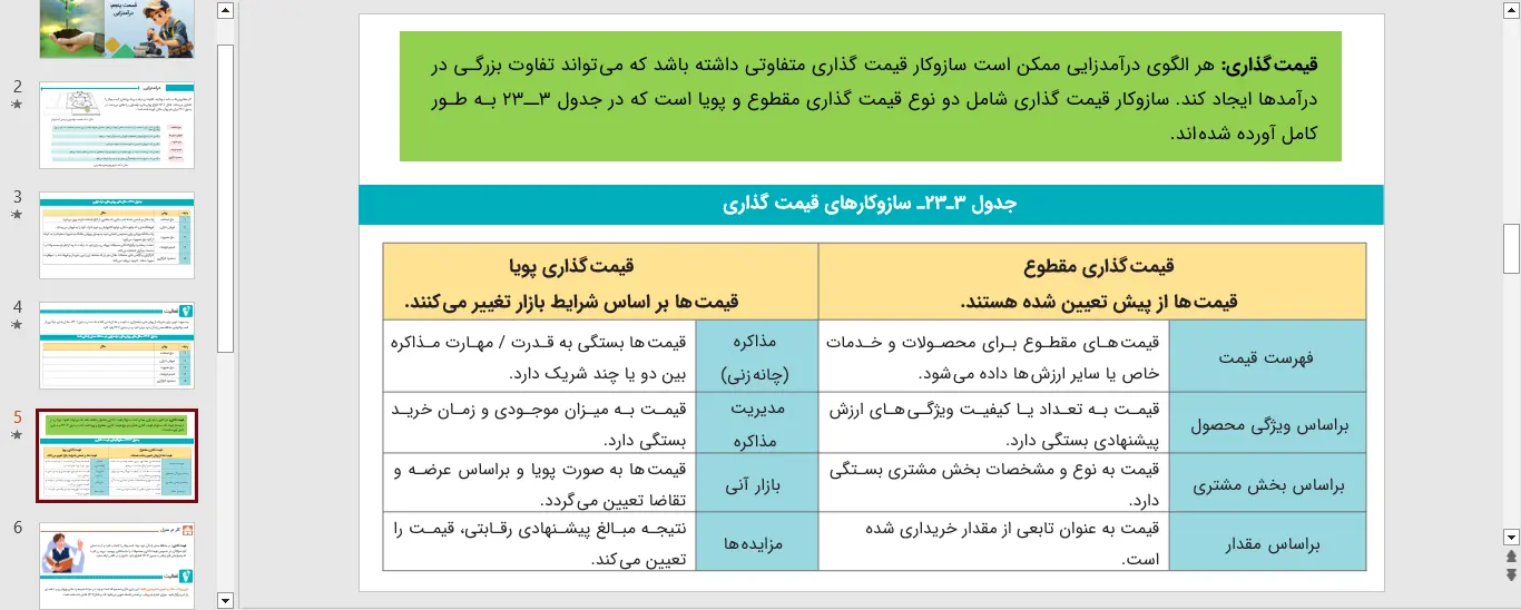 جزئیات و دانلود پاورپوینت کارگاه کارآفرینی و تولید پایه دهم بخش 23 – مدل کسب و کار قسمت پنجم: درآمدزایی – سال تحصیلی 1405-1404