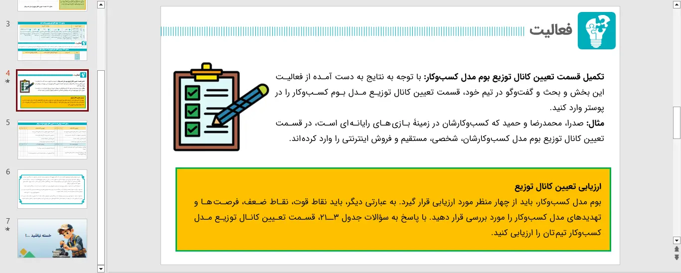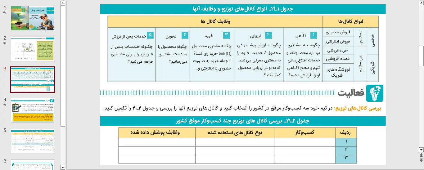 جزئیات و دانلود پاورپوینت کارگاه کارآفرینی و تولید پایه دهم بخش 21 – مدل کسب و کار قسمت سوم: تعیین کانال توزیع – سال تحصیلی 1405-1404