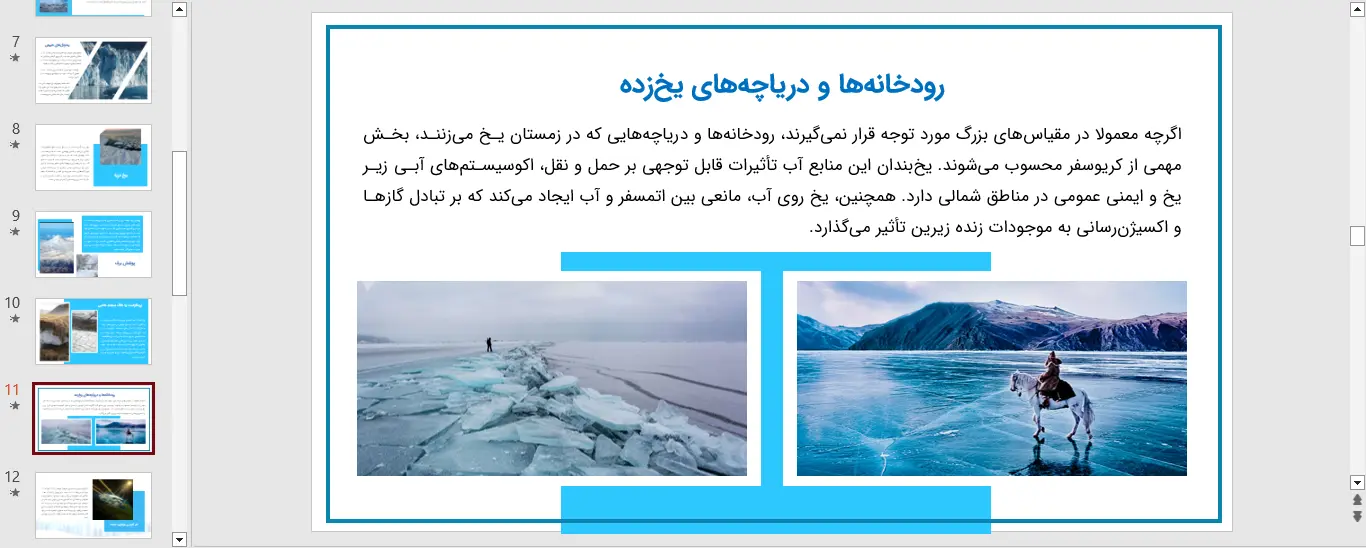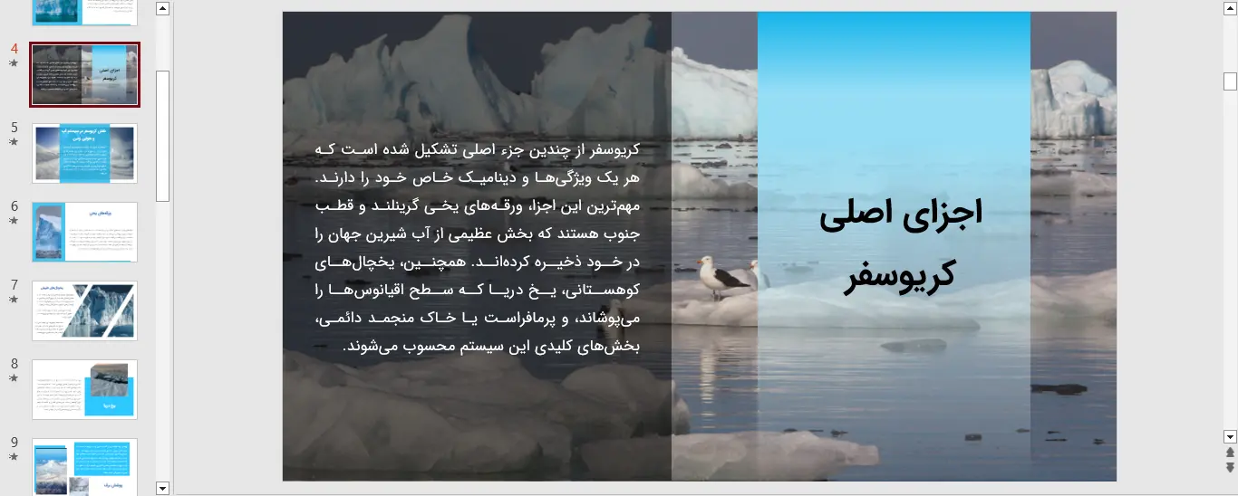 کریوسفر یک سیستم پویا و در حال تغییر است که رفتار آن مستقیماً بر حیات انسان و محیط زیست تأثیر میگذارد. برای آموزش موثر، انتقال اطلاعات علمی و دادههای پیچیده مربوط به این حوزه، استفاده از اسلایدهای حرفهای که با یک پاورپوینت کریوسفر قابل دسترسی هستند، بهترین راهکار خواهد بود.