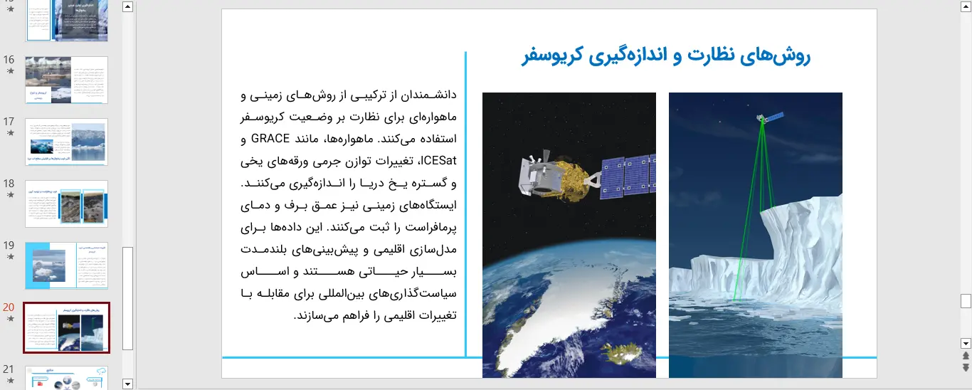 ارائه مدلهای پیشبینی ذوب و تأثیر آن بر جوامع انسانی در پاورپوینت کریوسفر میتواند اهمیت موضوع را برجسته سازد.