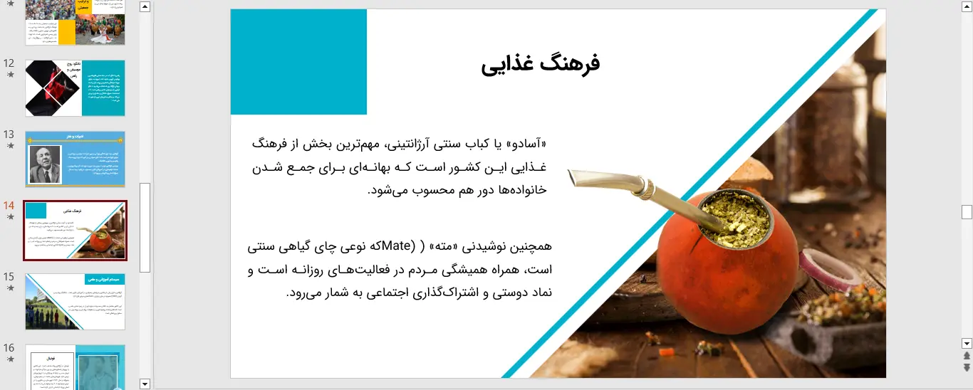 این پاورپوینت در قالب pptx. یا همان ppt. قابل دانلود می‌باشد. پاورپوینت کشور آرژانتین در محیط Microsoft Powerpoint طراحی شده و در 22 اسلاید در اختیار شما قرار داده شده است. کیفیت و صحت اطلاعات مربوط به این پاورپوینت توسط تیم نشریه فارسی درس تایید شده است و شما با چند کلیک می‌توانید به راحتی این پاورپوینت را دریافت کنید. درصورت بروز هرگونه اشکال می‌توانید با ما در تماس باشید.