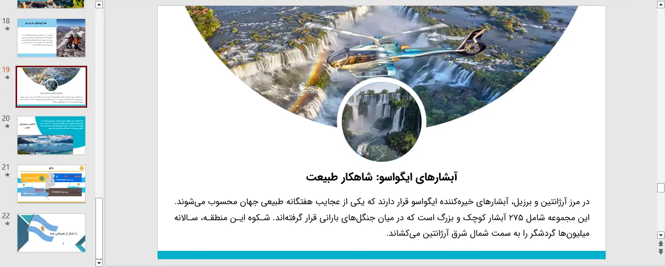 طبیعت آرژانتین بسیار متنوع است؛ از کوه‌های مرتفع آند گرفته تا دشت‌های پهناور پامپاس و یخچال‌های طبیعی پاتاگونیا. یکی از جذاب‌ترین مناطق این کشور آبشار ایگواسو است که در مرز برزیل و آرژانتین قرار دارد و جزو عجایب طبیعی جهان به شمار می‌آید. گنجاندن تصاویری از این مکان‌ها در پاورپوینت کشور آرژانتین می‌تواند جلوه بصری ارائه شما را بسیار زیبا و الهام‌بخش کند.
