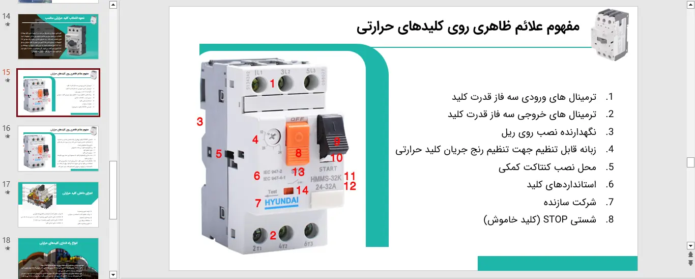 برای آشنایی کامل با نحوه عملکرد، انواع و کاربردهای این وسیله، استفاده از پاورپوینت کلید حرارتی می تواند گزینه ای بسیار مفید و آموزشی باشد. پاورپوینت کلید حرارتی معمولا شامل تصاویر، نمودارها و توضیحات فنی دقیقی است که نحوه عملکرد بخش های مختلف مانند بی متال، رله حرارتی و فیوز داخلی را توضیح می دهد.